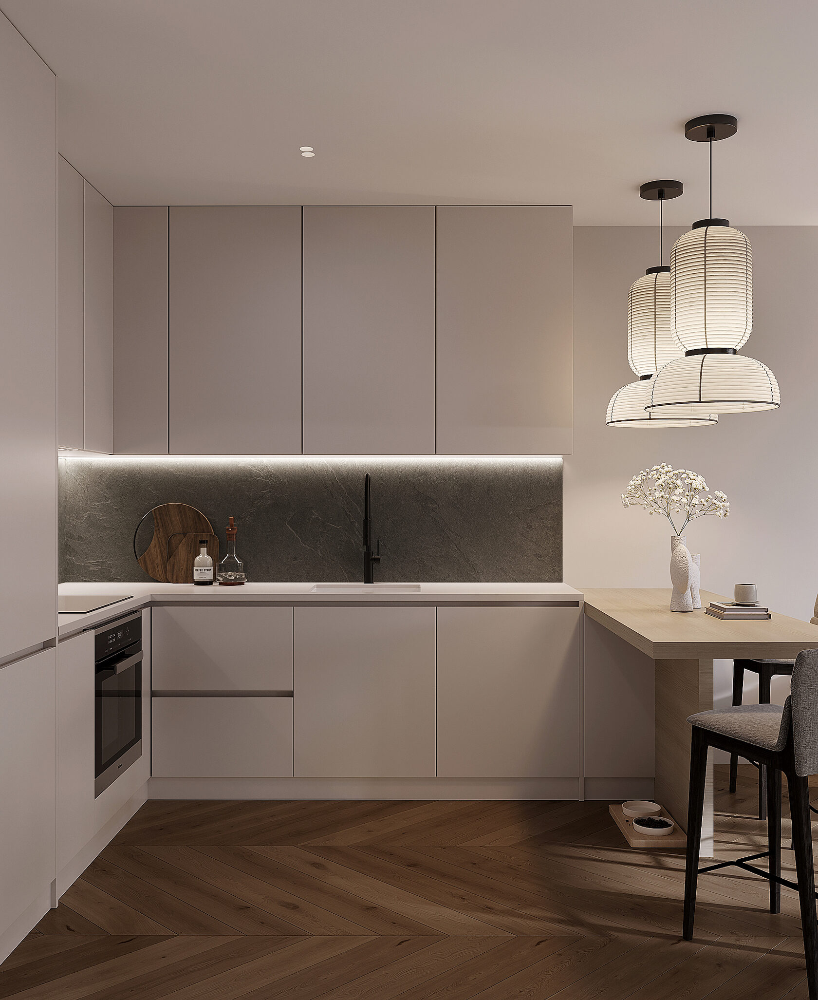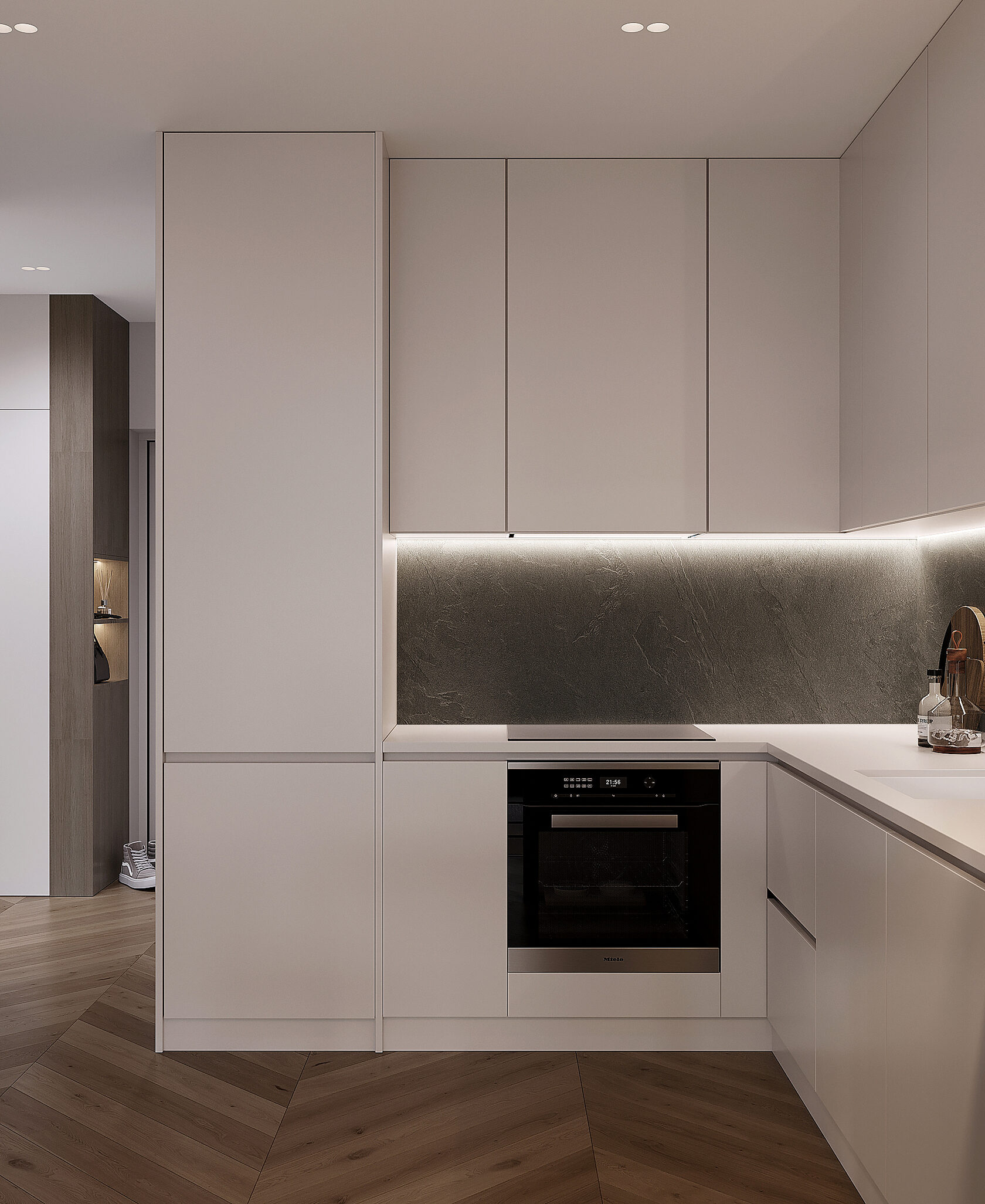 Кухня у квартирі є частиною загальної кімнати. Завдяки барній стійці вона ніби-то відгороджена від вітальні. Беручи до уваги невелику площу об’єкта, дизайнери інтер'єрного бюро Бєлік зробили кухонний гарнітур максимально містким. Меблі мають висоту до стелі. Вся побутова техніка вбудована, інвентар та посуд приховано за фасадами. Таке рішення дозволило лишити вдосталь місця на робочій поверхні.