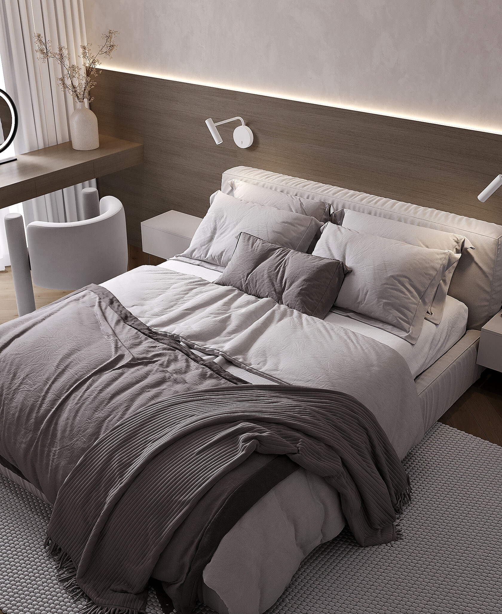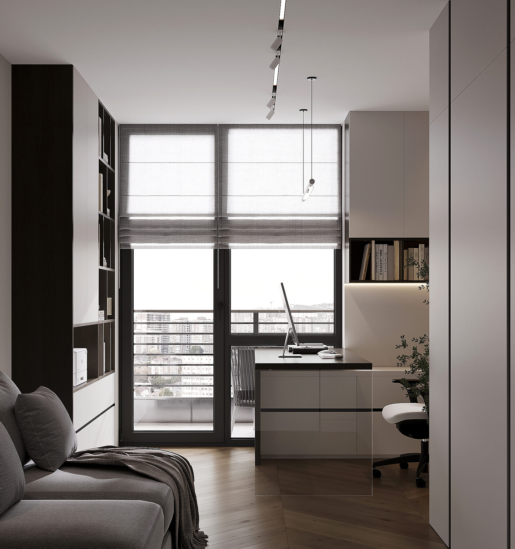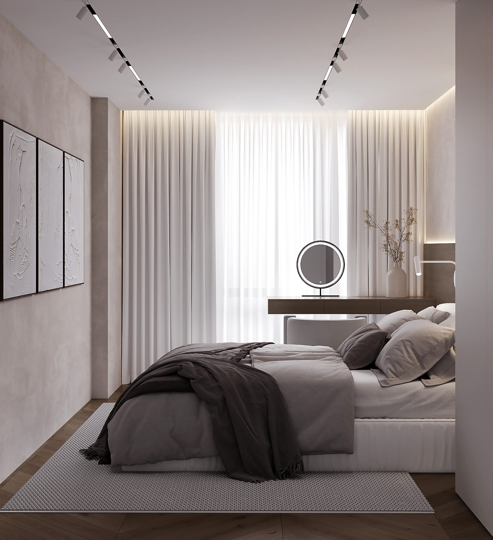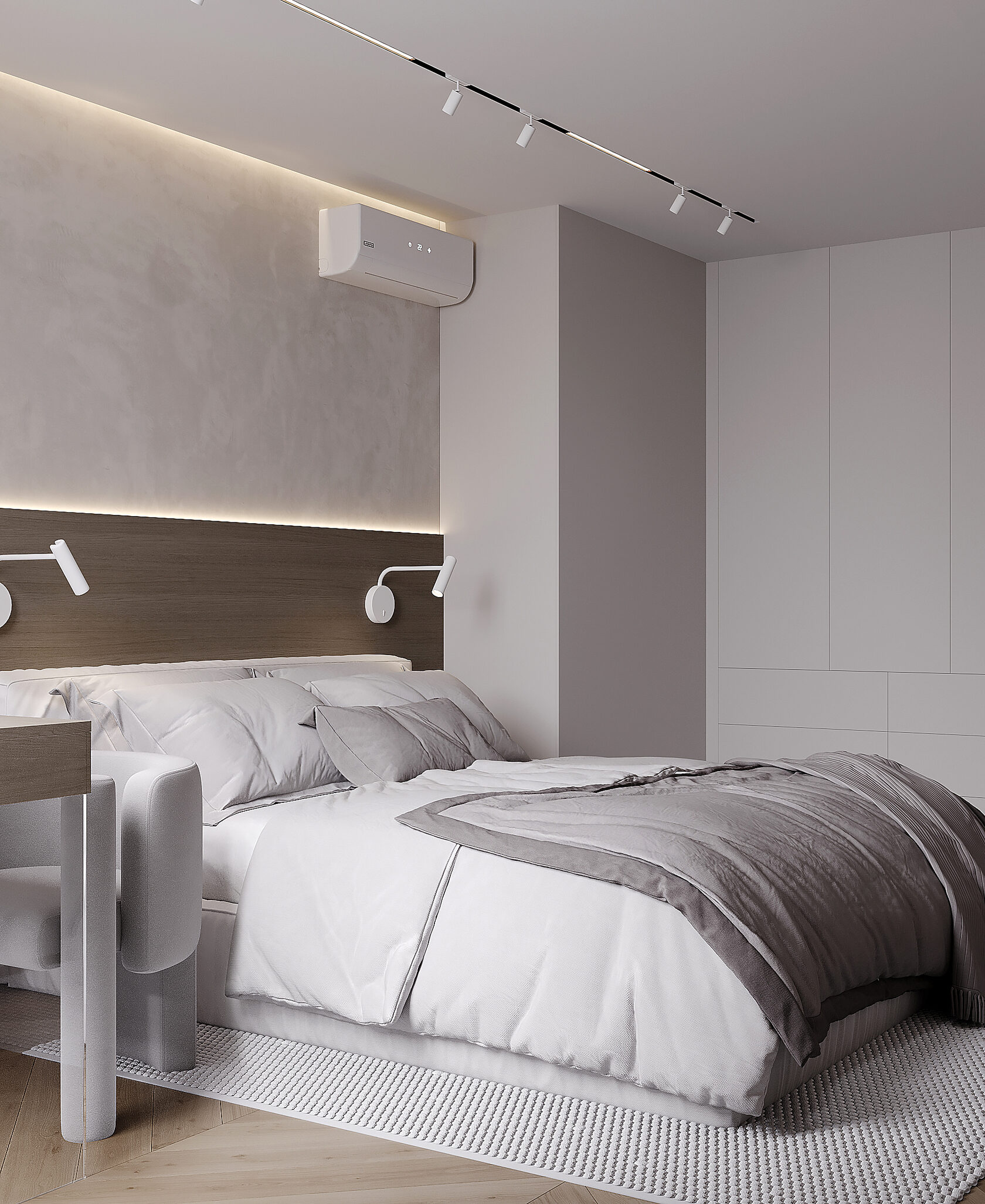 Крім кухні-гостиної в цій квартирі були облаштовані всі інші кімнати у відповідній концепції. Мова йде про спальню та кабінет. Використання тих самих матеріалів, фактур, відтінків, стилістично схожого декору та освітлювальних приладів дозволити створити єдину композицію на всьому об'єкті. Спальня та кабінет виконують головні функції, з чим допомагають правильно підібрані меблі. Простір в них не переобтяжений масивними шафами та комодами. Корпусні меблі зробили переважно вбудованими та майже непомітними. Фасади та двері були підібрані у тон з оздобленням, тому ці меблі не впадають в око, а виступають частиною стін.