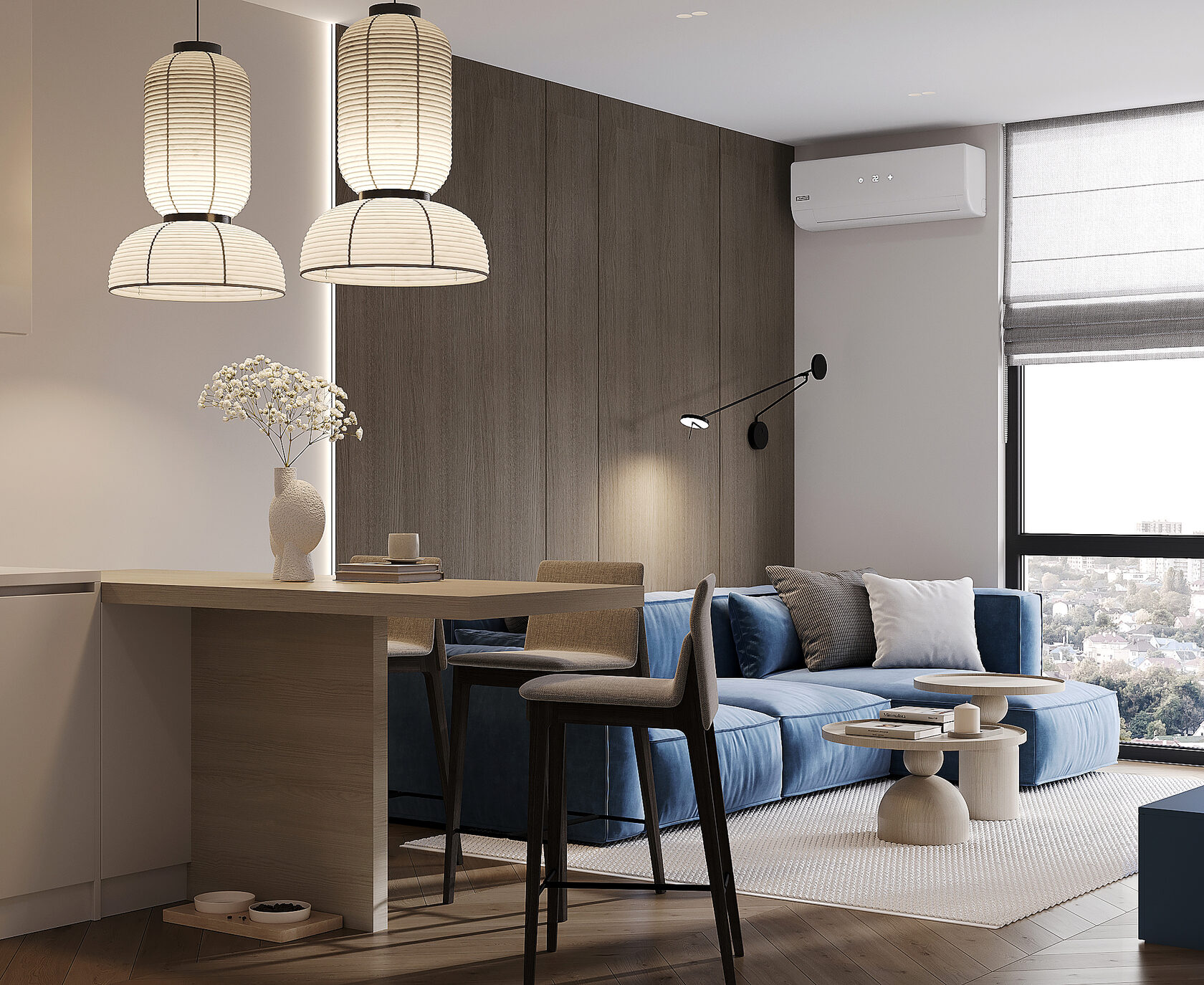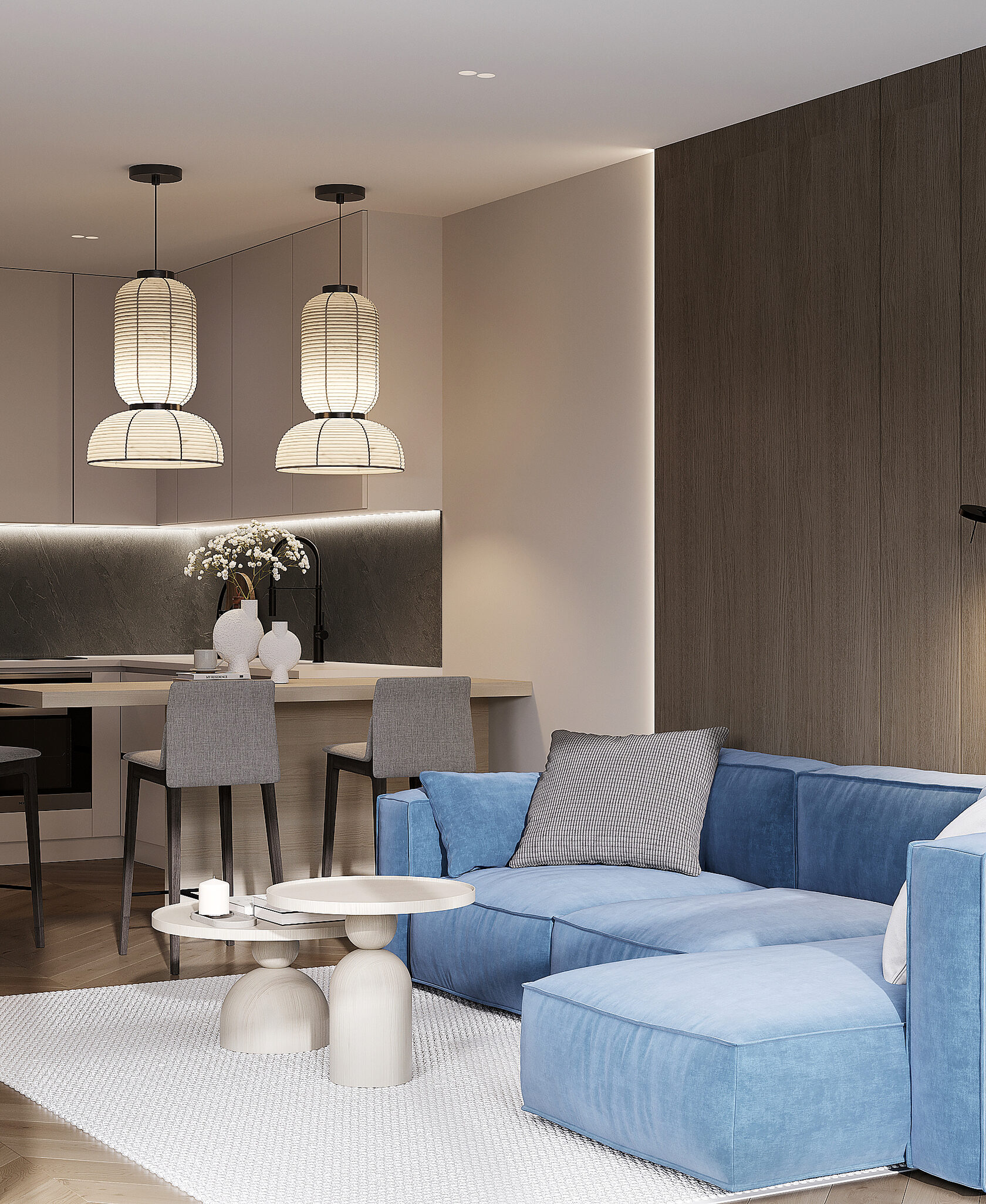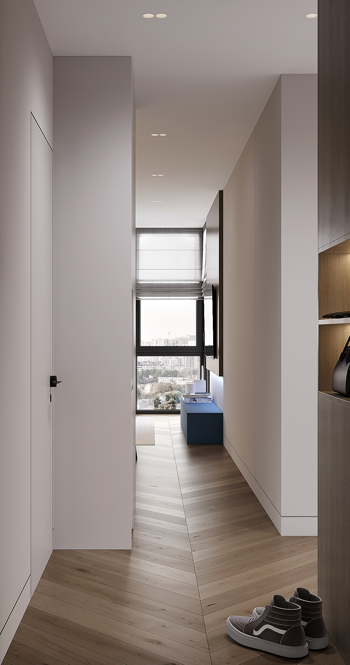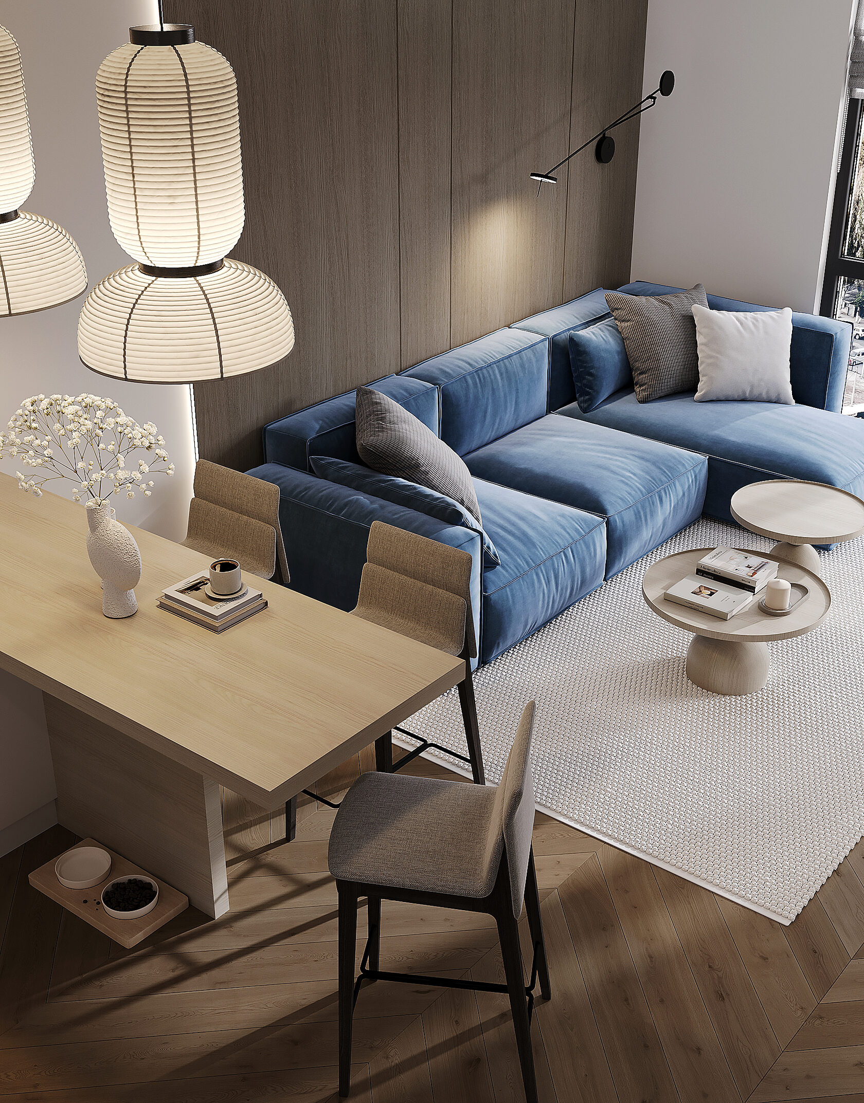 Саме ці засади використала інтер'єрна компанія Бєлік облаштовуючи об'єкт в ЖК Варшавський 2. Крім світлих кольорів дизайнер інтер'єрів вирішив додати соковитих акцентів та цікавих фактур. Меблі (диван, фасади корпусних виробів) були обрати насичених відтінків синього. Не лише білий та синій кольори використали при оформленні квартири. Також їх “розвели” різними відтінками монохрому (сірий, беж, бетон, граніт).
