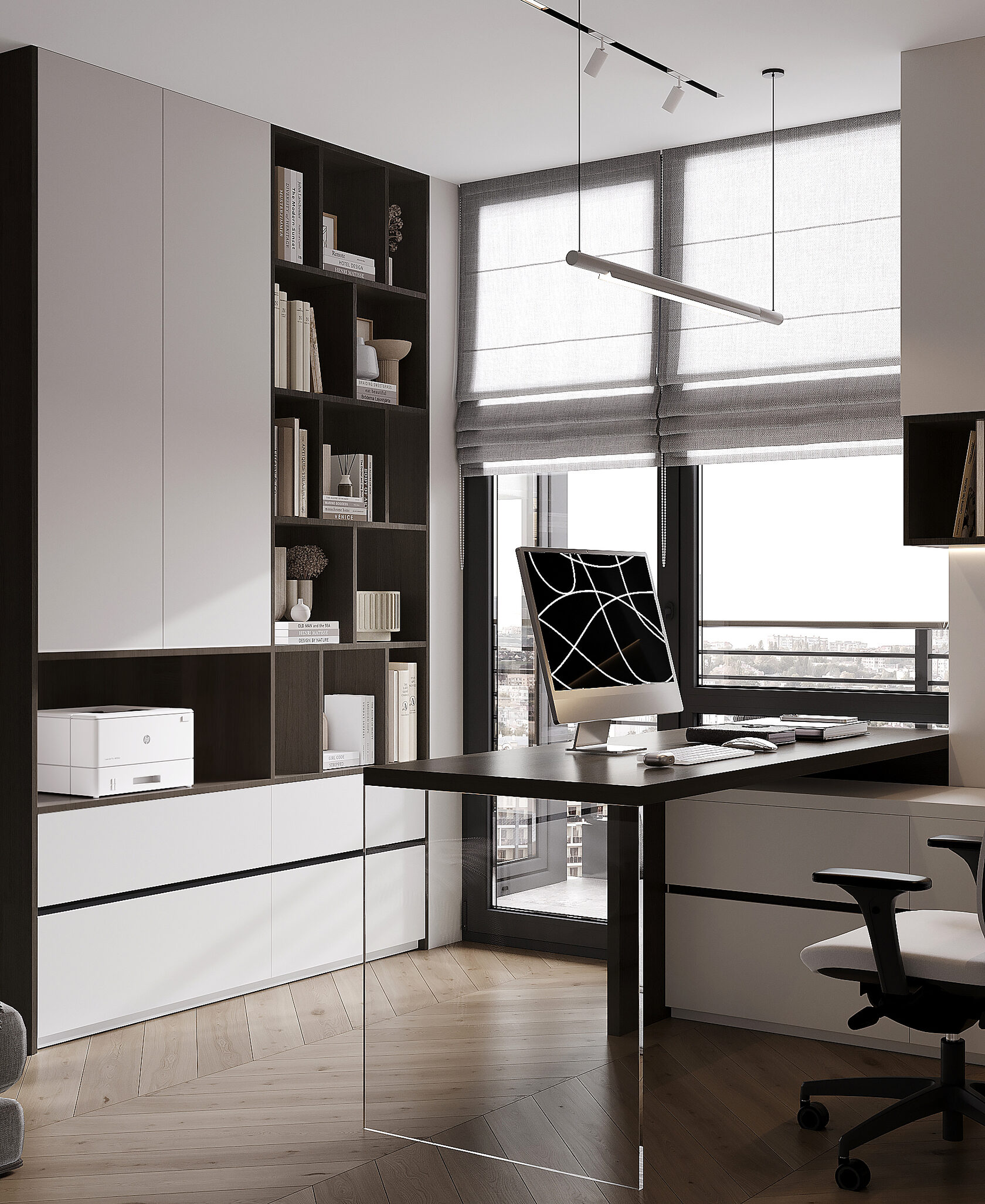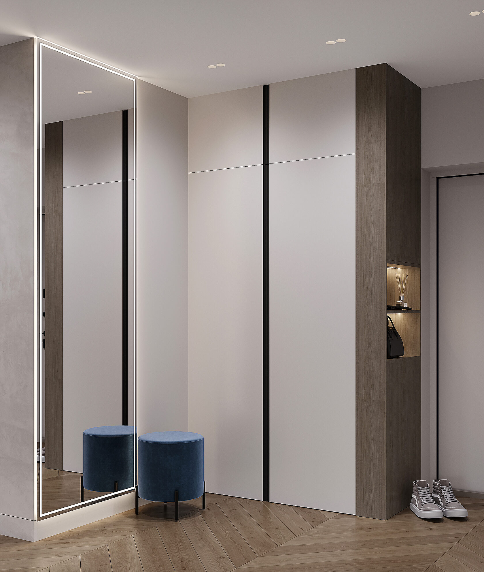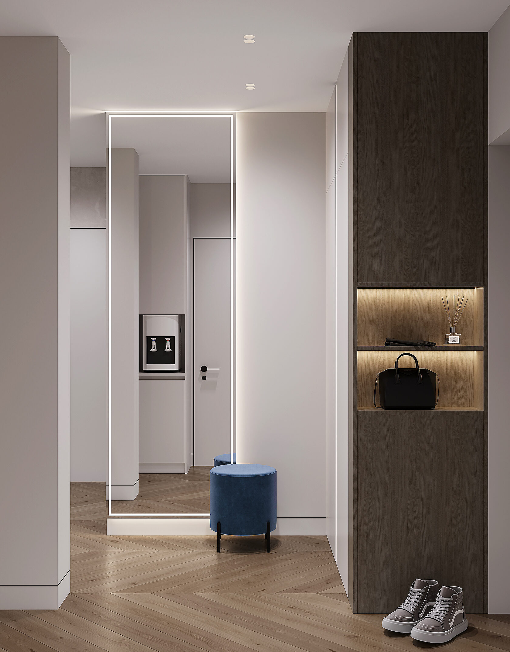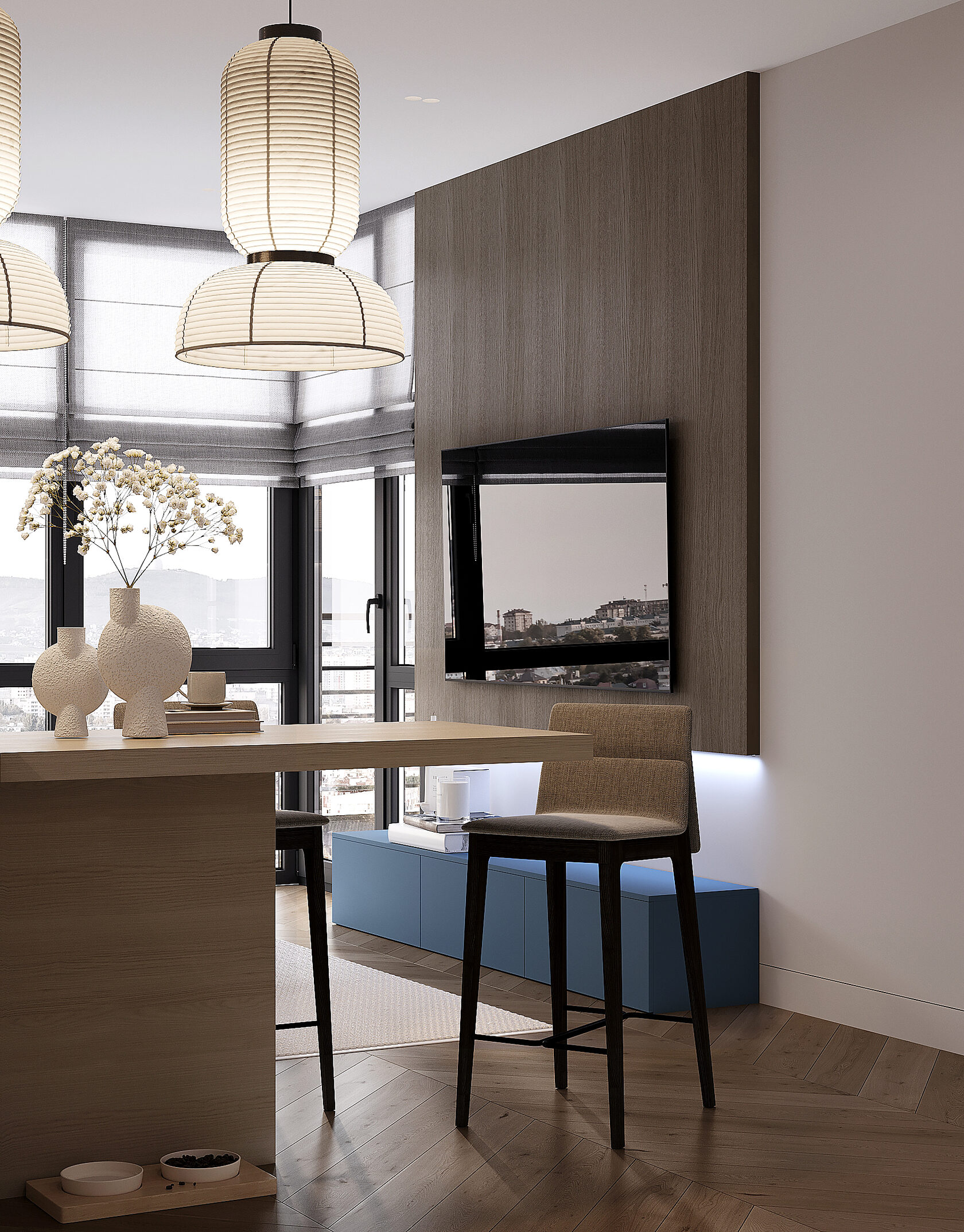 Саме ці засади використала інтер'єрна компанія Бєлік облаштовуючи об'єкт в ЖК Варшавський 2. Крім світлих кольорів дизайнер інтер'єрів вирішив додати соковитих акцентів та цікавих фактур. Меблі (диван, фасади корпусних виробів) були обрати насичених відтінків синього. Не лише білий та синій кольори використали при оформленні квартири. Також їх “розвели” різними відтінками монохрому (сірий, беж, бетон, граніт).
