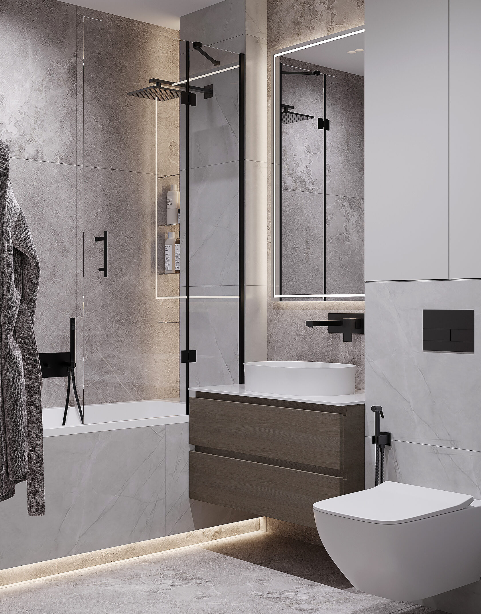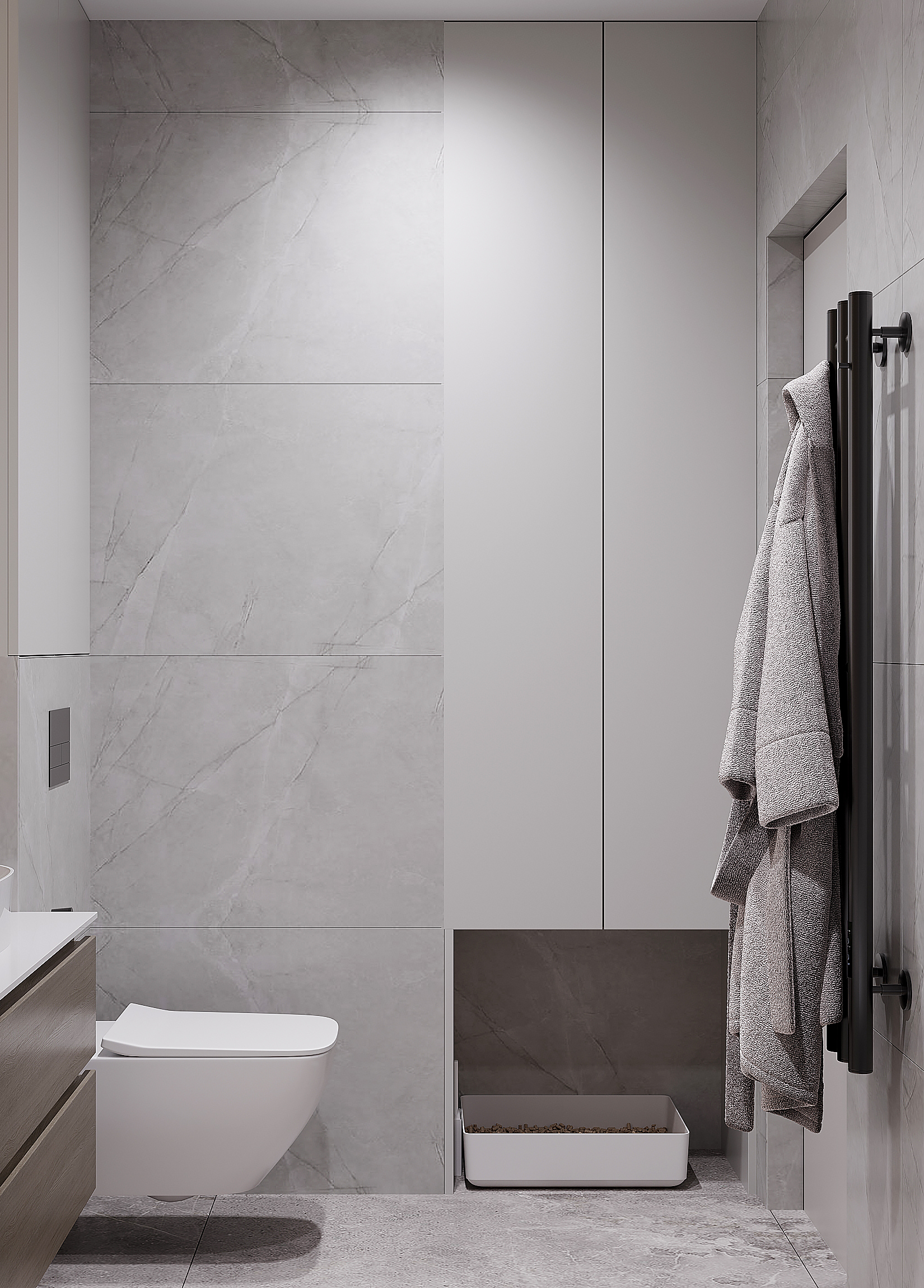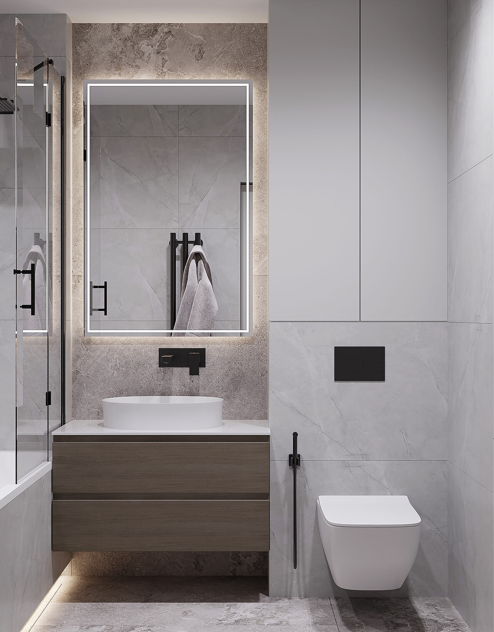 Дизайн проект двокімнатної квартири у ЖК Варшавський 2, як і будь-якого об'єкта, неможливий без оформлення ванної кімнати. Дизайнери бюро інтер'єрів Бєлік не лише зробили це приміщення гарним. Максимум зусиль було покладено на досягнення функціональності та безпеки в санвузлі. Обиралися якісні та стійкі до вологи матеріали, зручна сантехніка та вбудовані елементи меблів для зберігання (рушники, засоби гігієни та догляду тощо). Всі технічні аспекти прокладання комунікацій (каналізація, освітлення, теплі підлоги, водопостачання) також було промірковано до дрібниць.