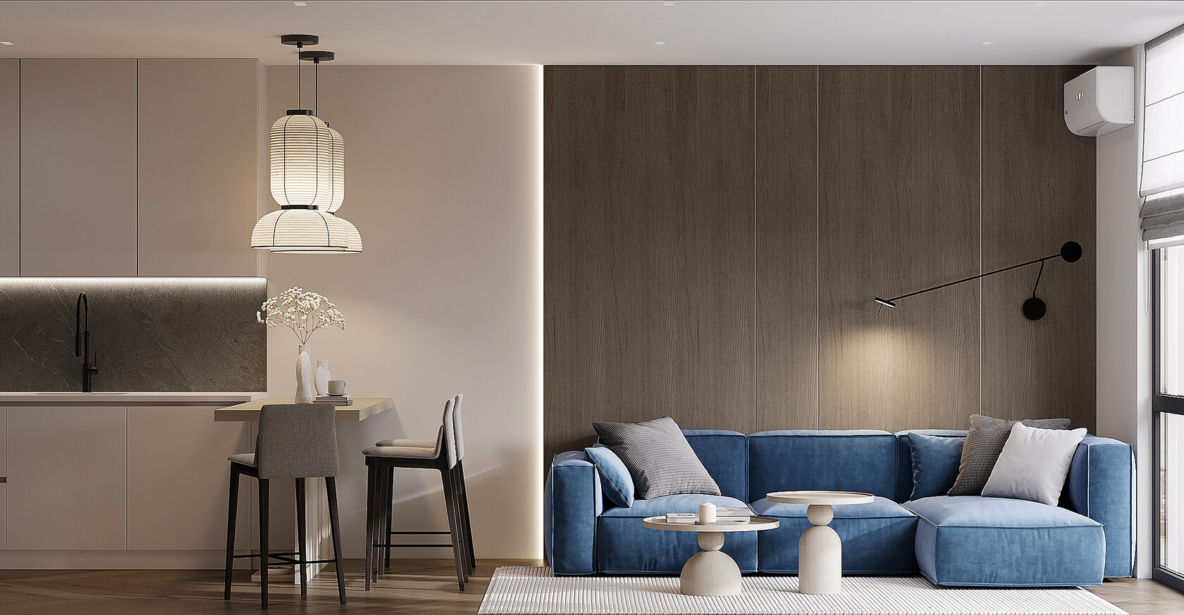 Сьогодні майже нікого не здивуєш наявністю кімнати-студії. Для невеликих об'єктів це не лише візуально естетично. Це логічне та технічно правильне рішення. Адже відсутність стін між гостиною та кухнею дозволяють заощадити декілька м2. На місці стін можна розмістити обідній стіл або більш просторий диван. Що стосуються розподілу кімнати на зони? Сьогодні це максимально легко зробити за допомогою переходів фактур та відтінків, декору, використання освітлювальних приладів у кожній з них.