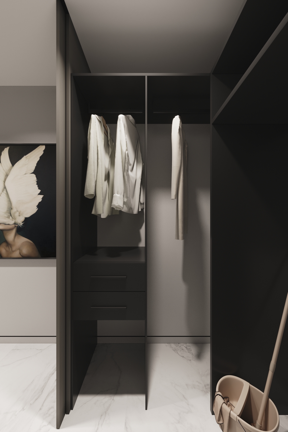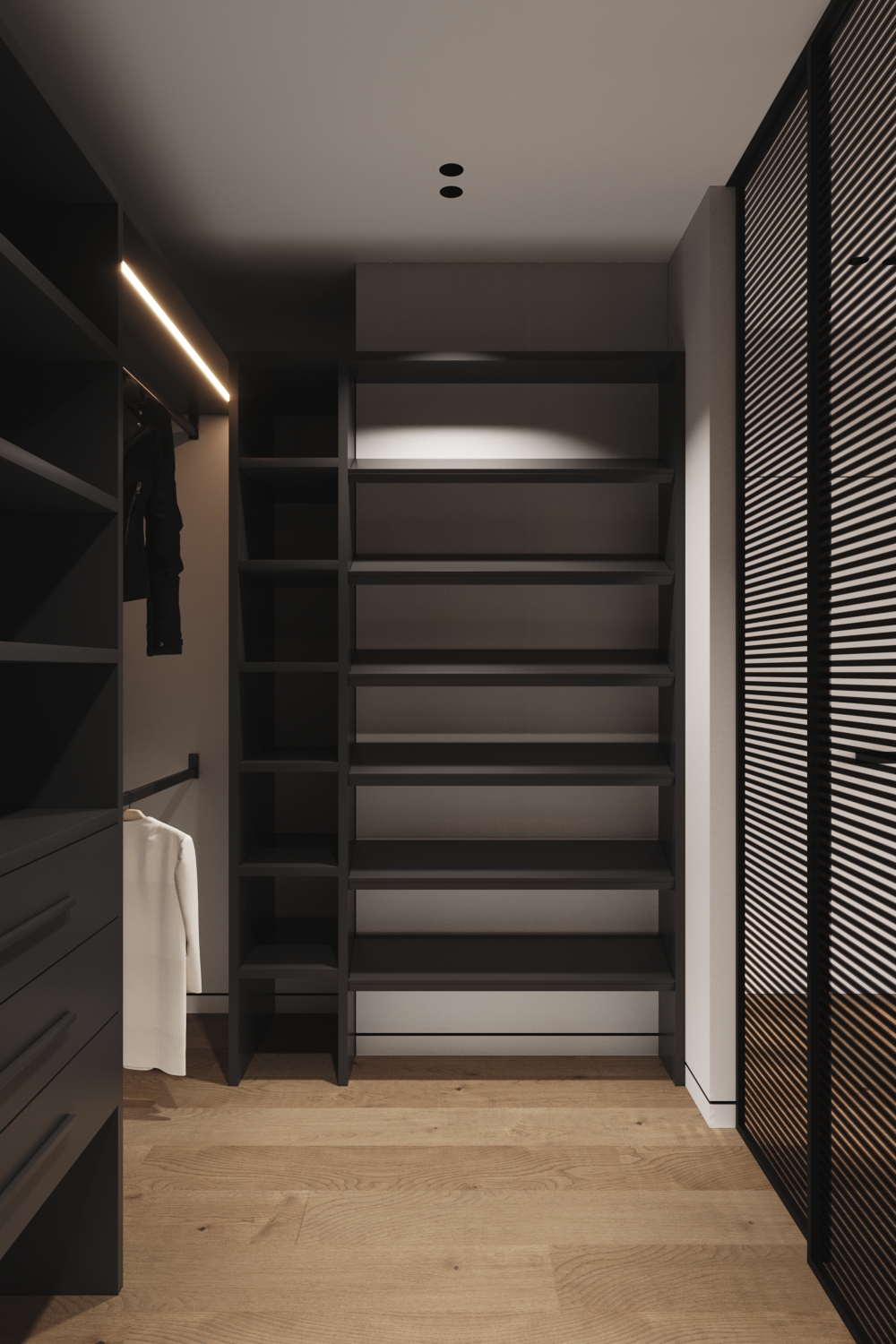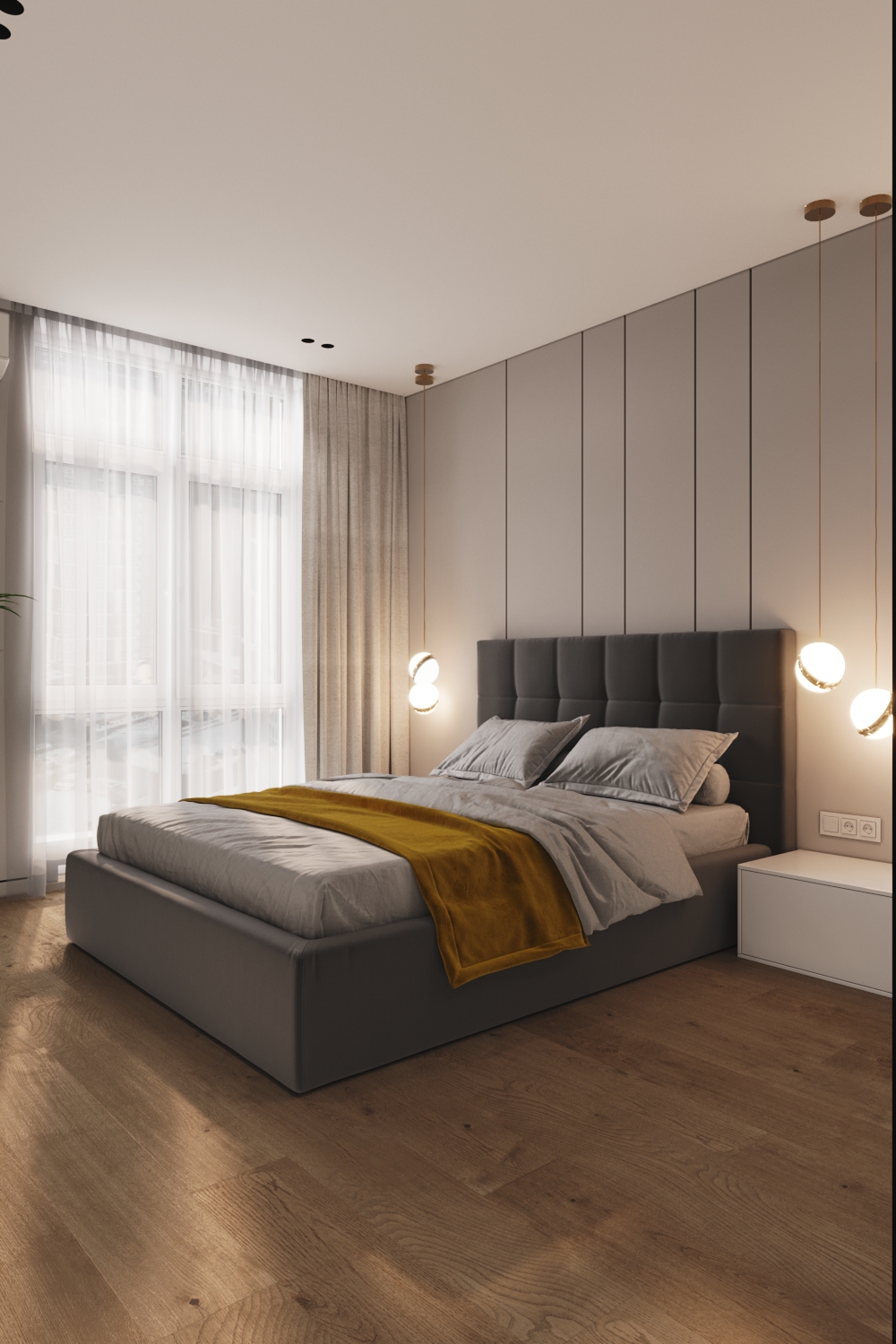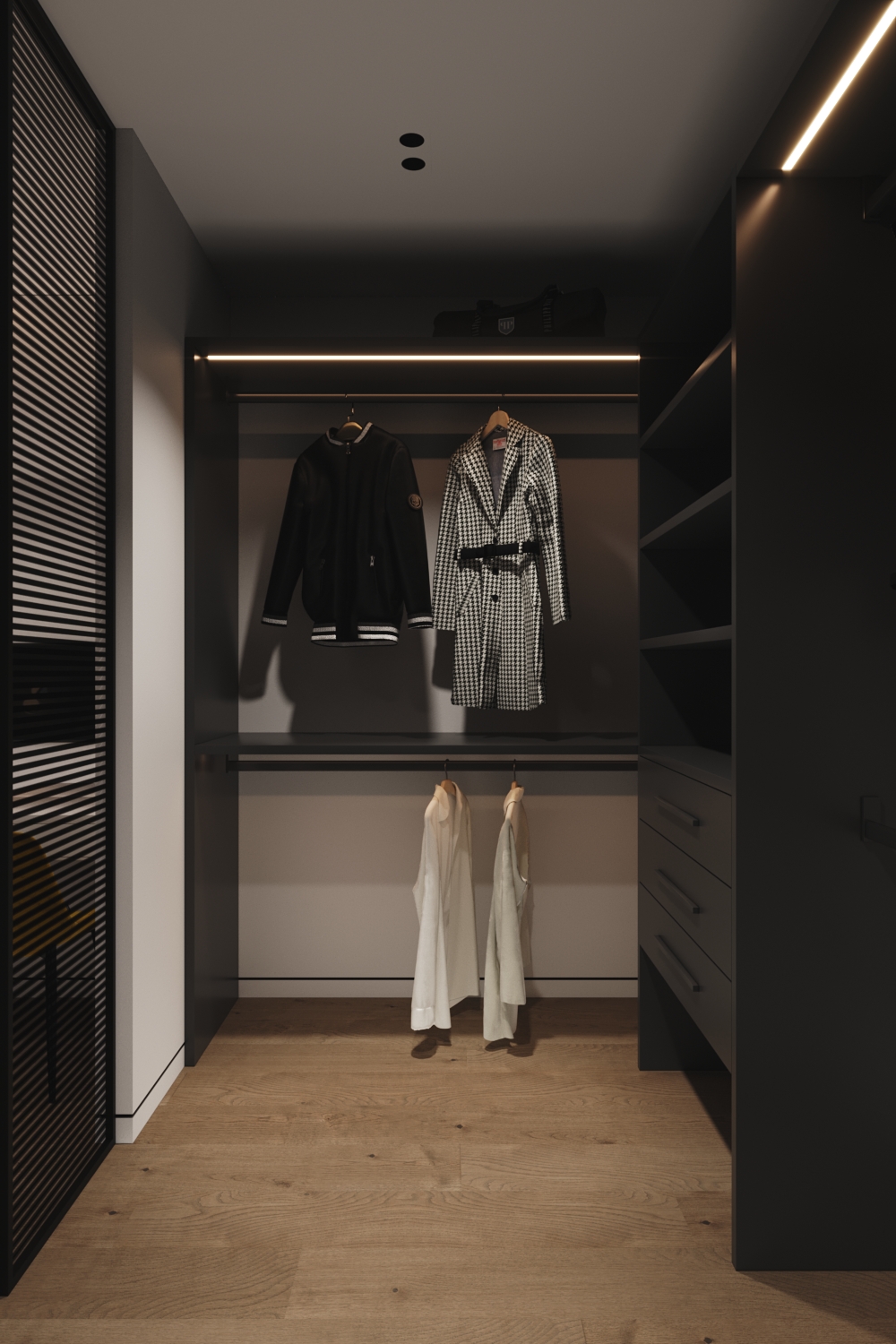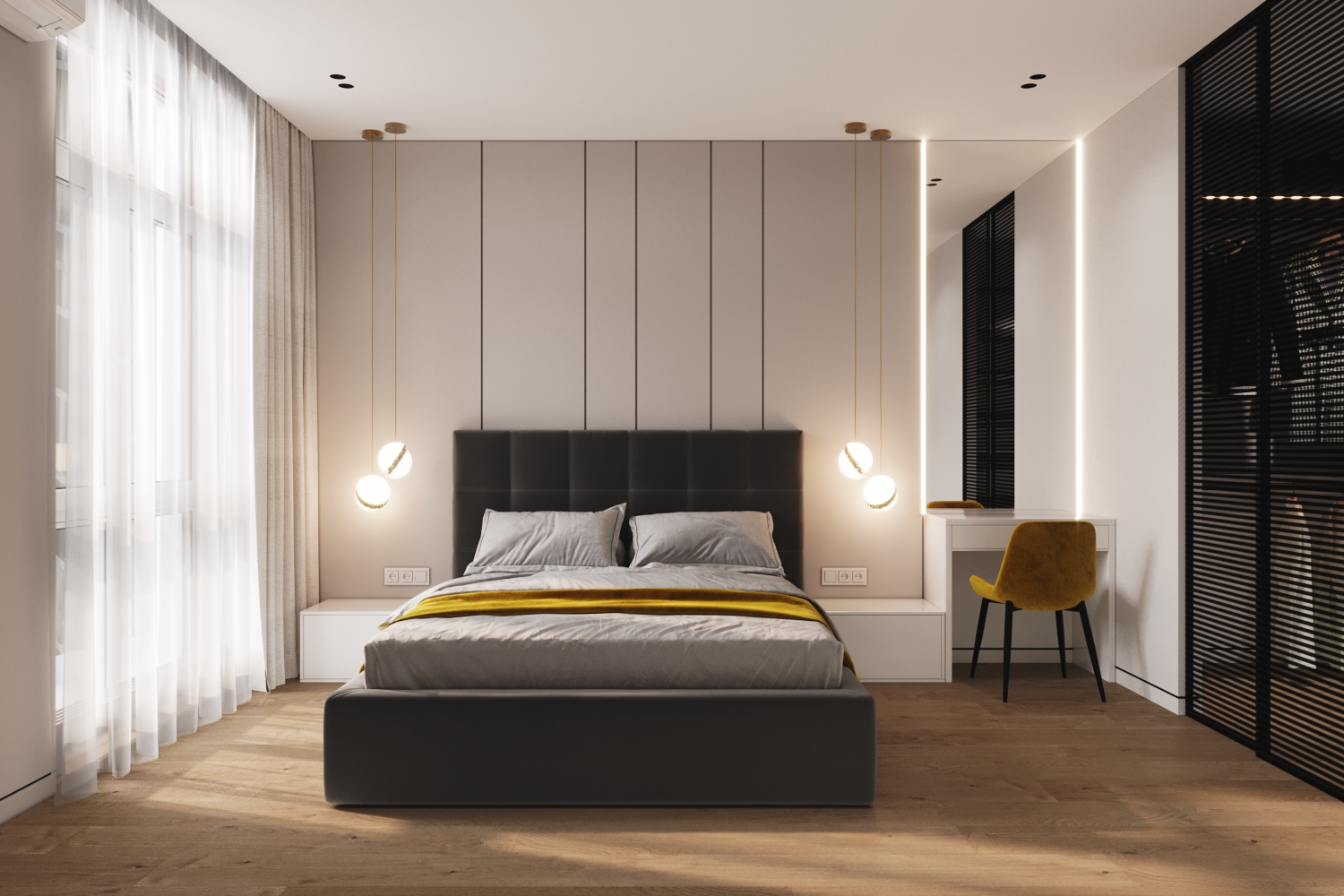Це не квартира-студія, а саме однокімнатний об'єкт. Тому крім вітальні з кухнею тут також присутня спальня. Виконана вона у витриманому стилі. З м'яким ліжком посередині, приліжковими полицями та косметичним столиком. В кімнатах немає зайвих корпусних шаф, адже більшість речей сховано у гардеробних. Для них дизайнери зуміли виділити окремі місця, зробивши достатньо місткими та майже не помітними.
