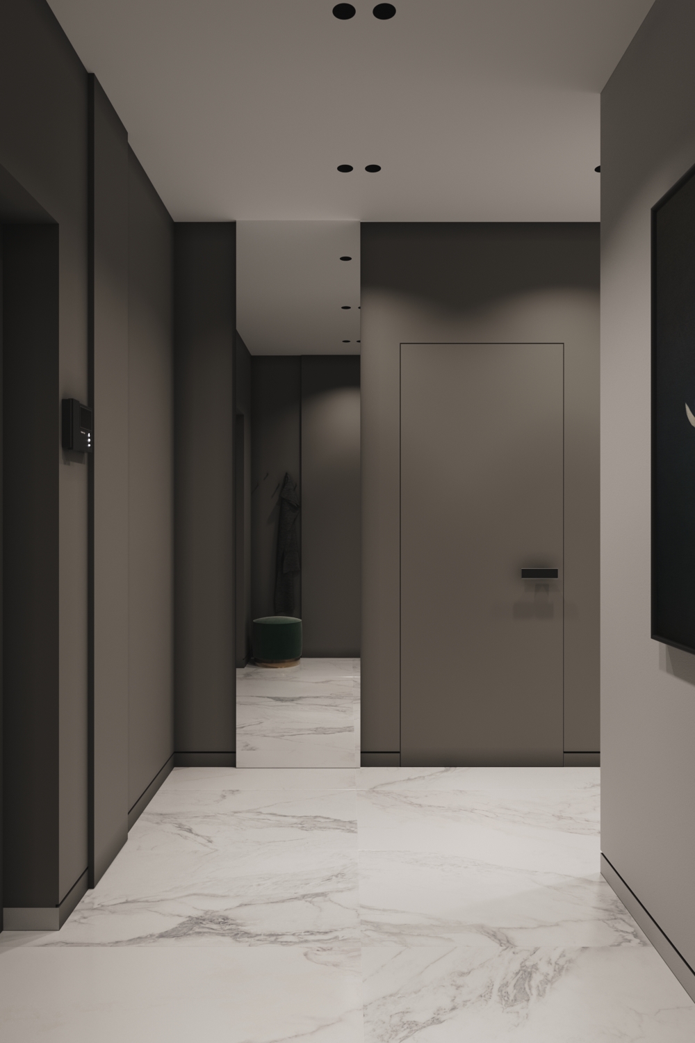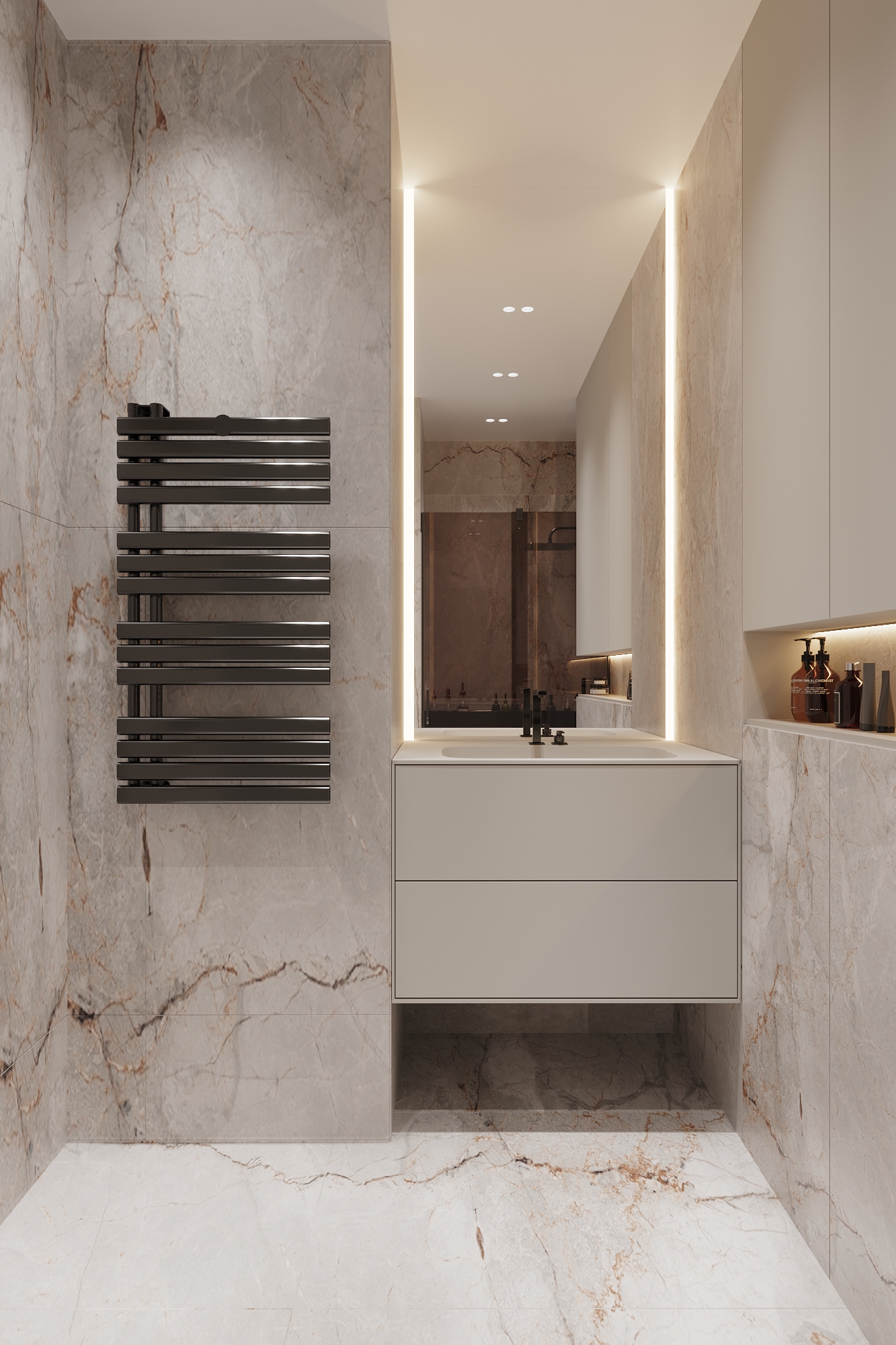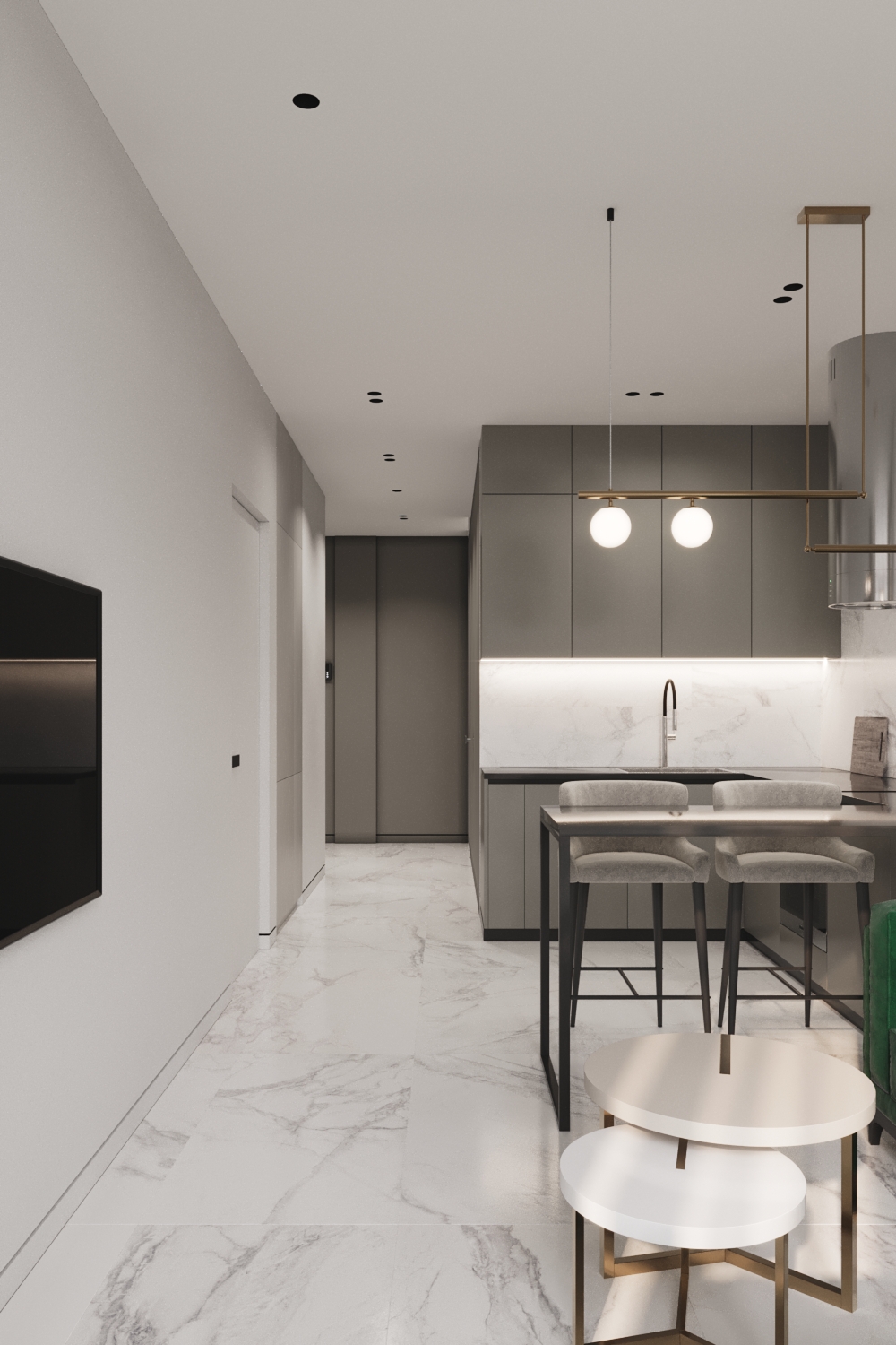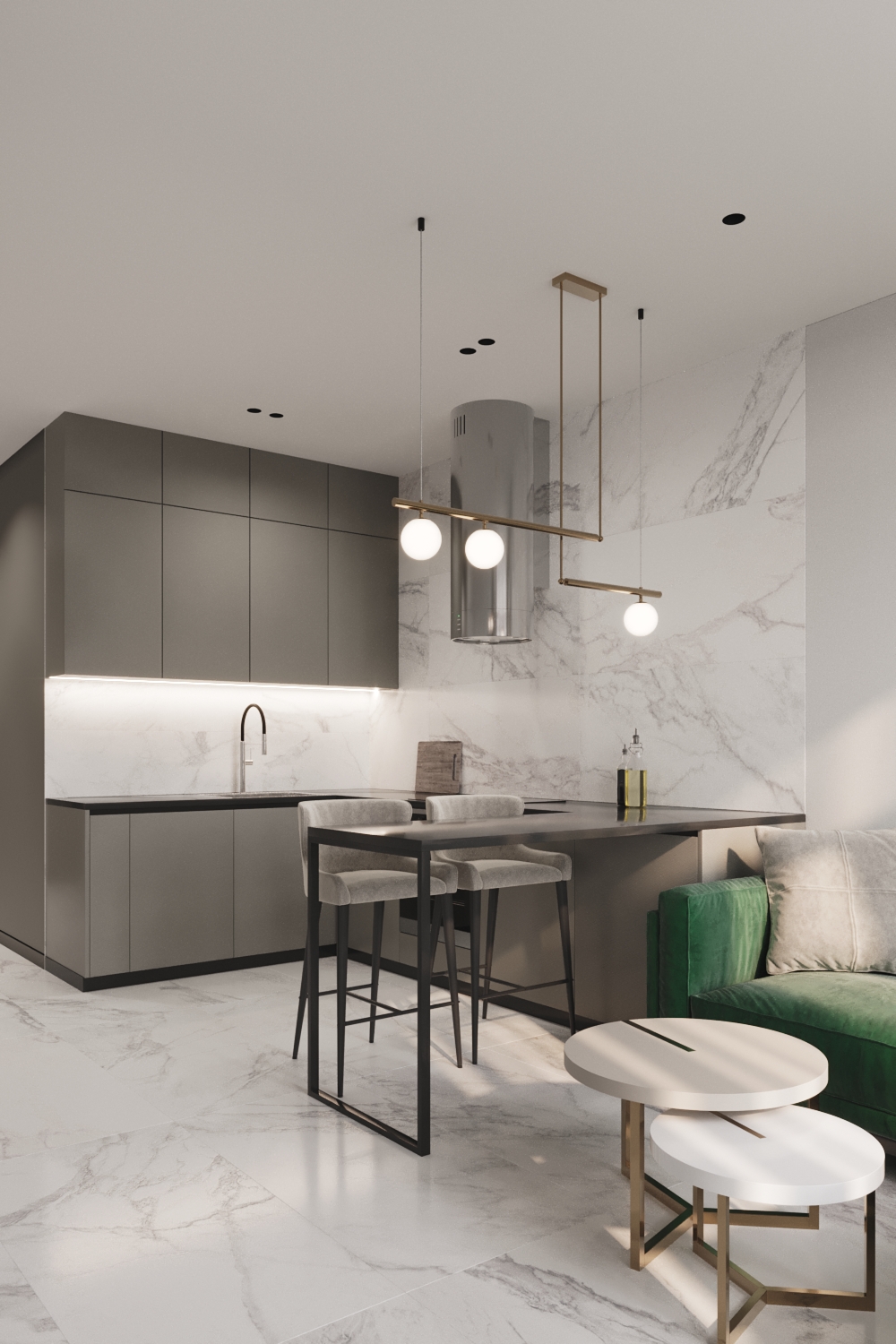 Використання світлих політр також найкраще рішення для однокімнатних квартир. Замість ідеального білого кольору використовувалися цікаві фактури та поєднання. Присутні мармурові візерунки на стінах та підлозі, сірі матові фасади на корпусних шафах.