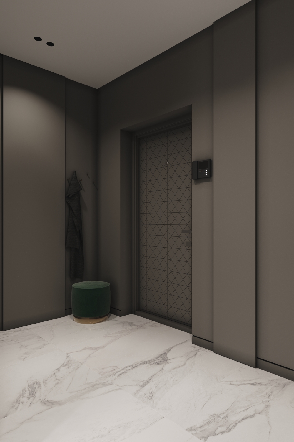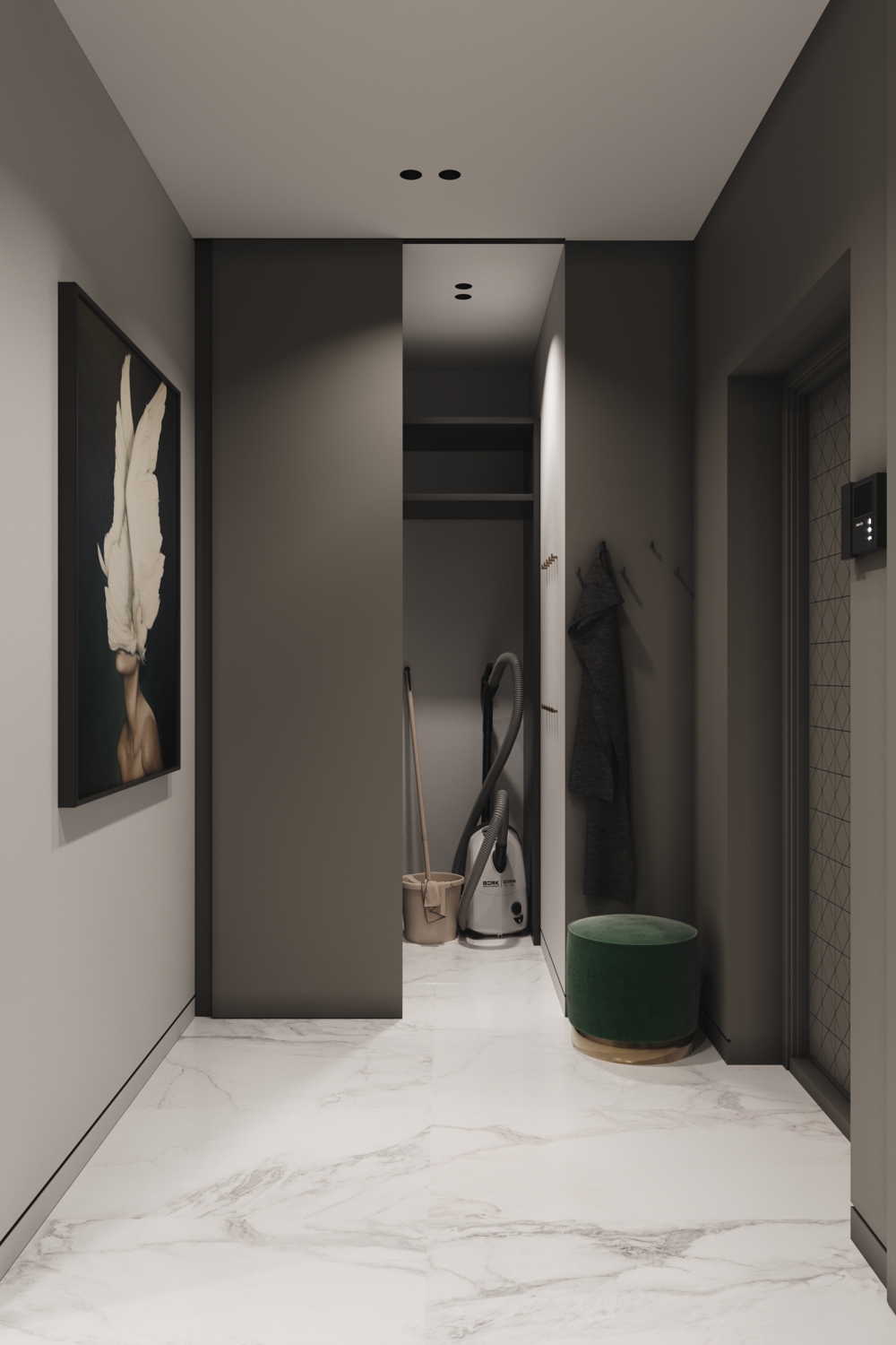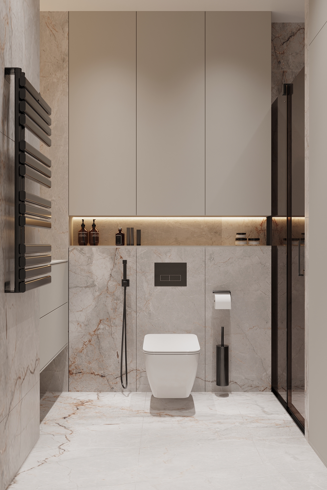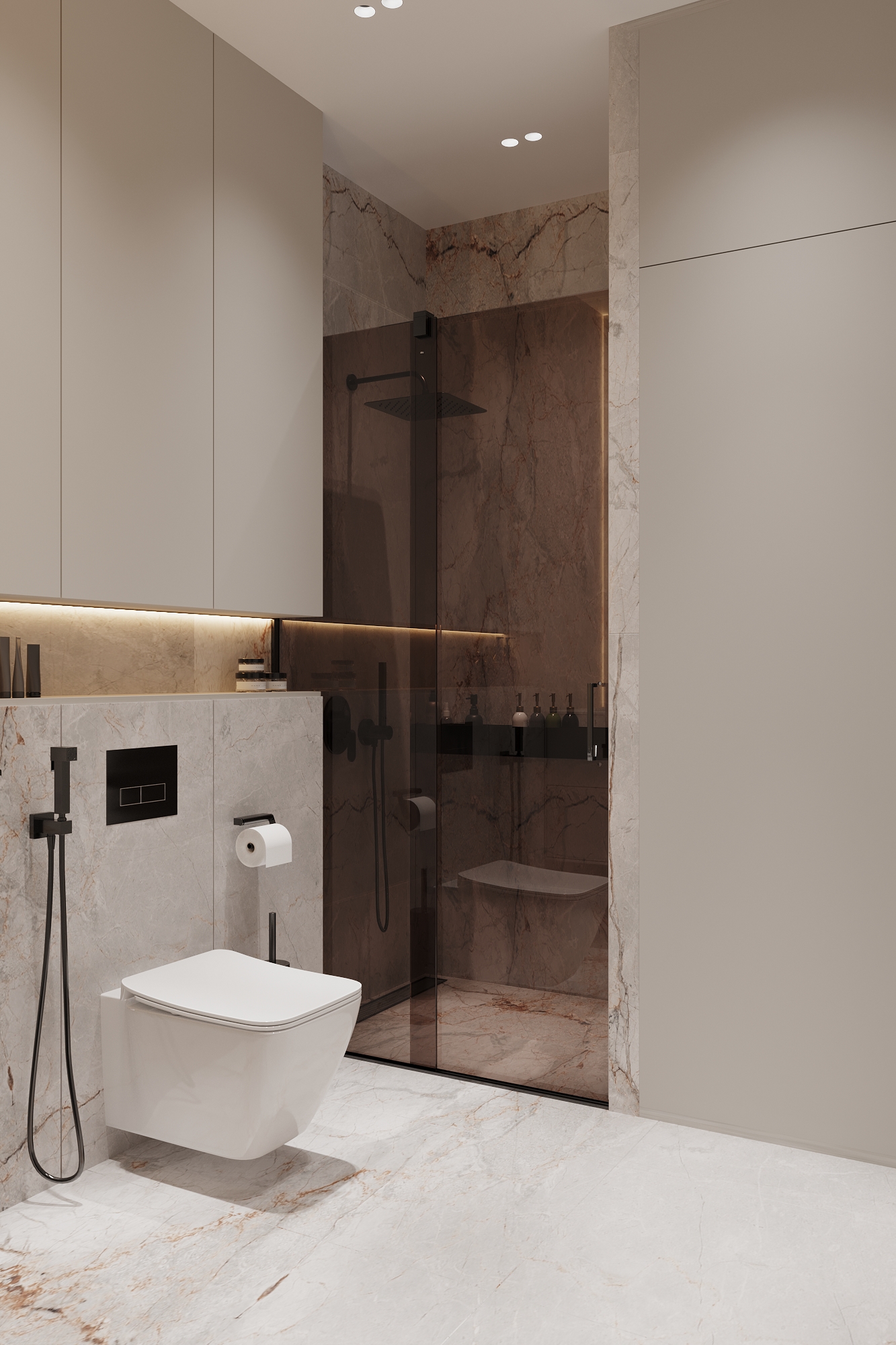 Використання світлих політр також найкраще рішення для однокімнатних квартир. Замість ідеального білого кольору використовувалися цікаві фактури та поєднання. Присутні мармурові візерунки на стінах та підлозі, сірі матові фасади на корпусних шафах.