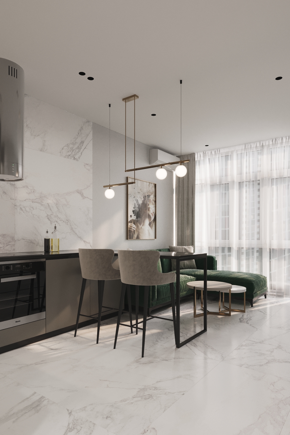 Розділ простору у вітальні-кухні відбувається завдяки використанню меблів. Саме барна стійка виступає елементом на межі. Також на зони допомагають поділити кімнату окремі освітлювальні прилади, переходи відтінків та палітр в оздобленні. Щоб не переобтяжувати простір дизайнер інтер'єрного бюро відмовився від важких штор. Замість них були обрані легкі фіранки, які підкреслюють панорамні вікна.