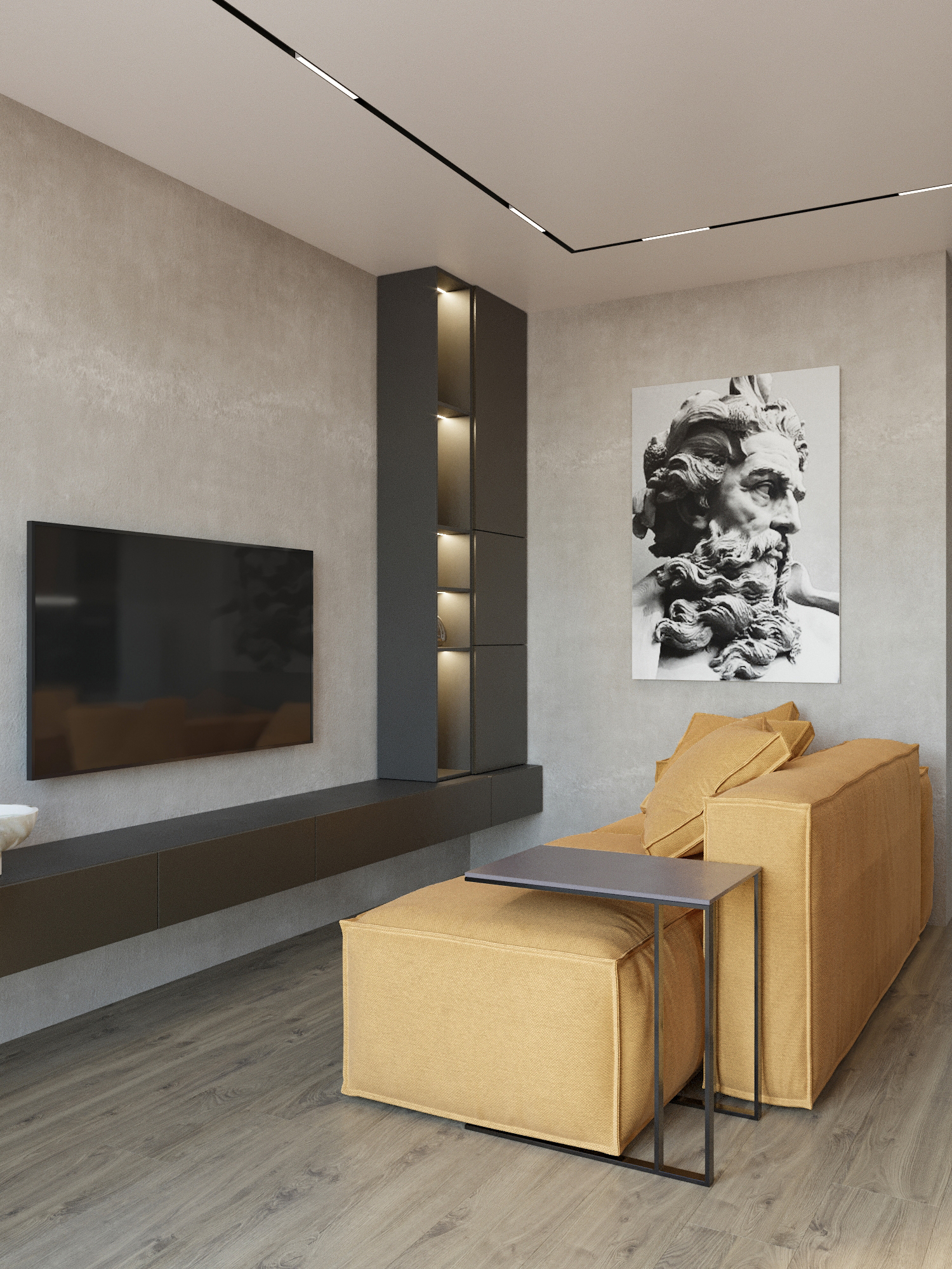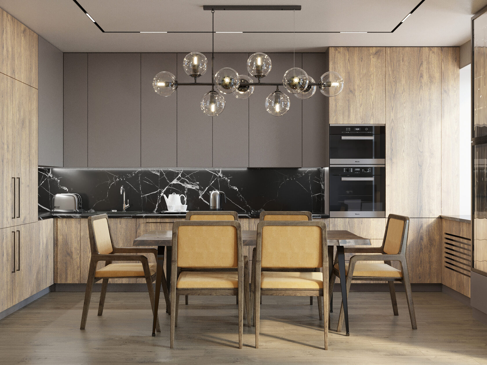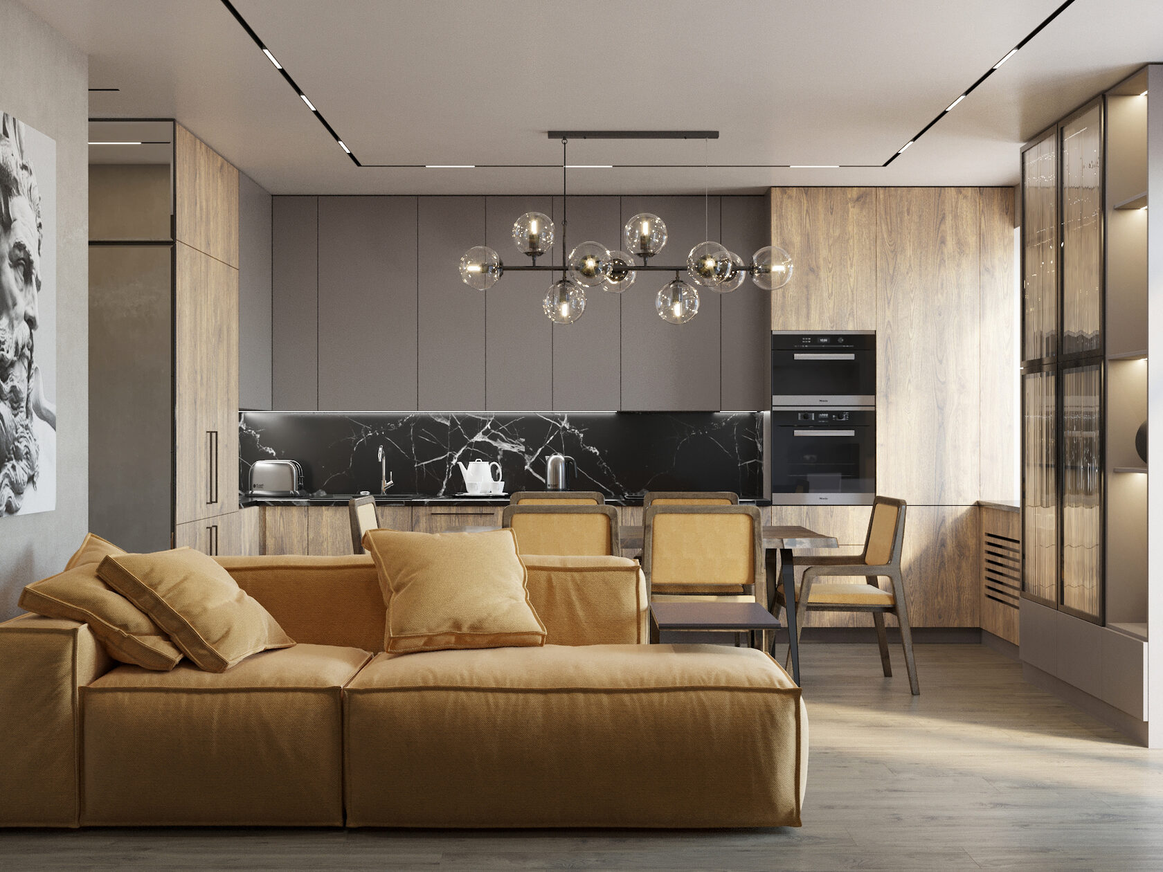 В інтер’єрі переважають темні палітри, витримані планувальні рішення, мінімальна кількість декору, дерев’яні фактури. Останнє є не доповненням та цікавим акцентом, а саме базою. Дерев’яні меблі (столи, фасади) та їх елементи, оздоблення стін панелями, підлога - все це виглядає дуже ефектно. Щоб простір не тиснув, розвели ці фактури однотонними матовими елементами (сірі, бежеві, мармурові, чорні). Важливим стало додавання в інтер'єр більш яскравих елементів. Для квартири в ЖК Вишнева Оселя було обрано насичений гірчичний колір, який присутній в оббивці диванів, крісел, декоративних подушок, текстилі, окремих елементів декору.
