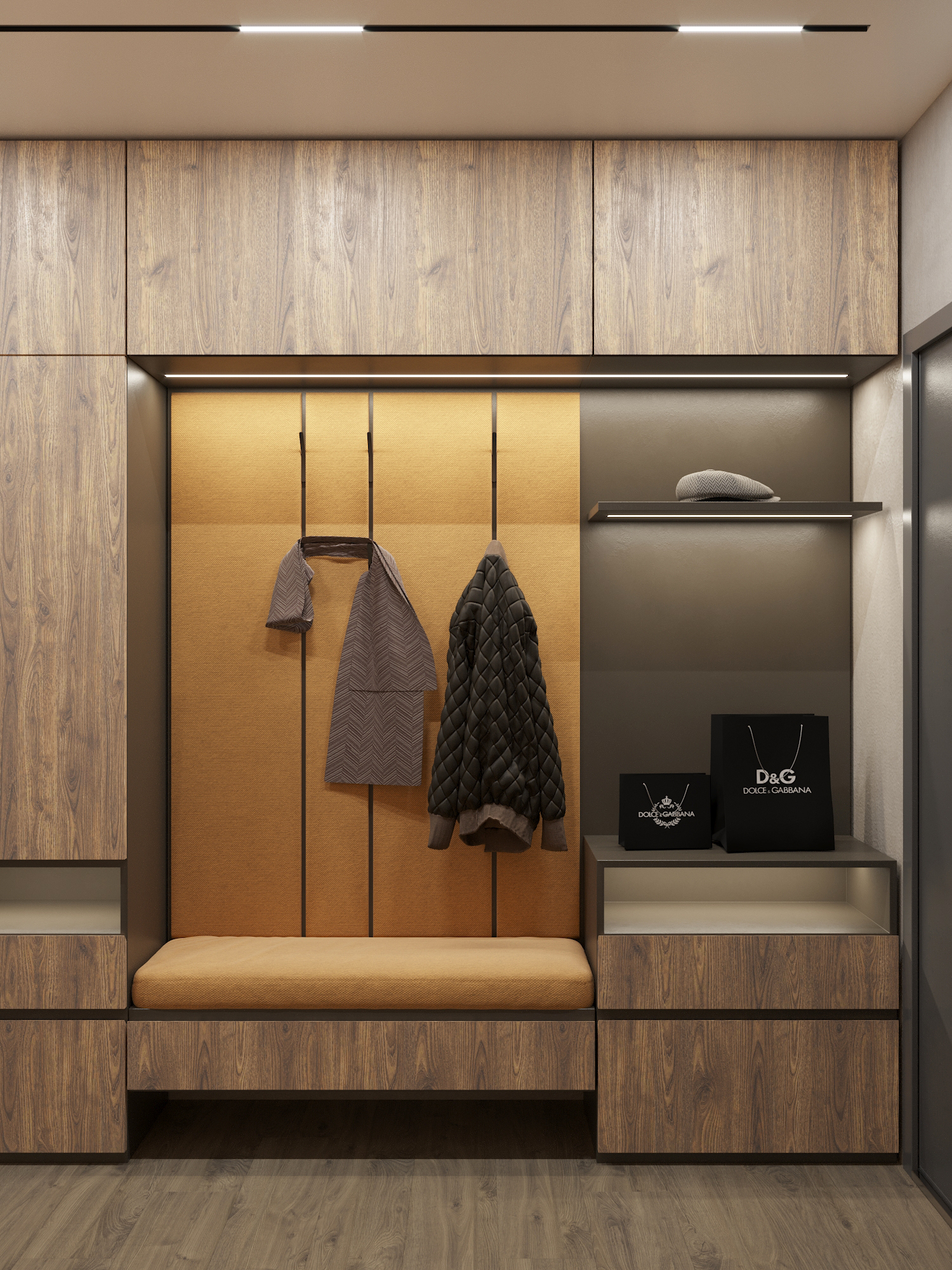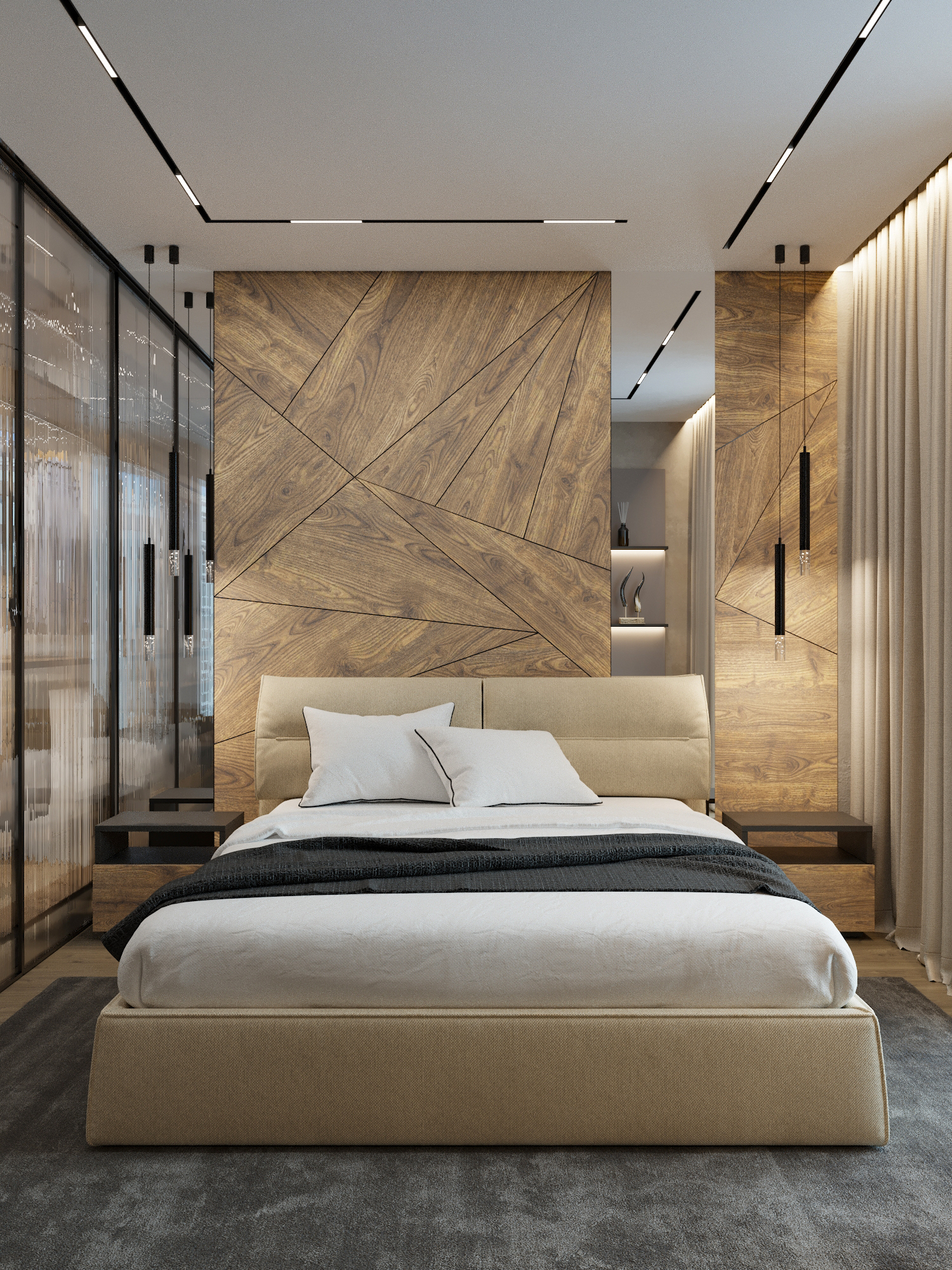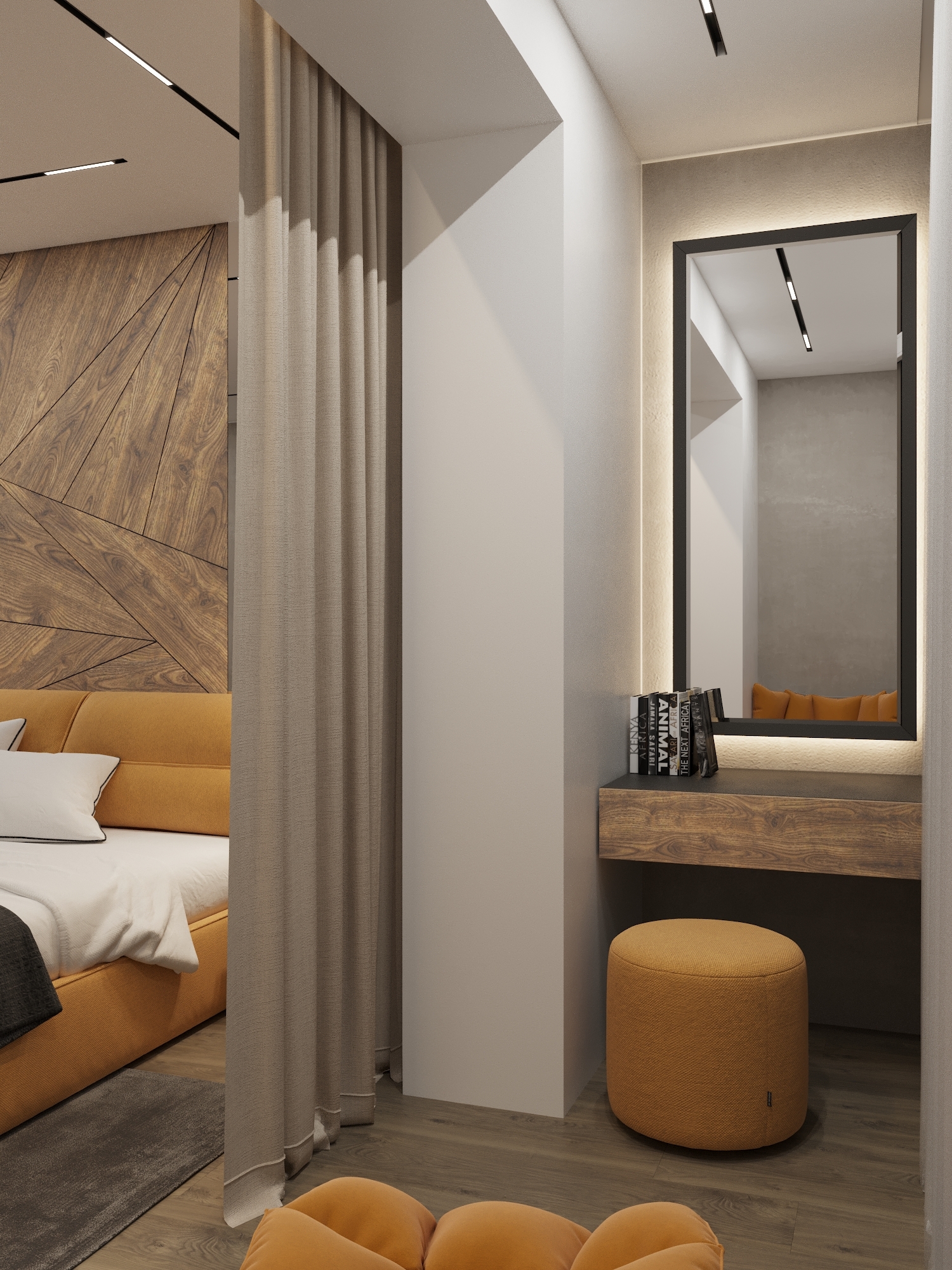 В інтер’єрі переважають темні палітри, витримані планувальні рішення, мінімальна кількість декору, дерев’яні фактури. Останнє є не доповненням та цікавим акцентом, а саме базою. Дерев’яні меблі (столи, фасади) та їх елементи, оздоблення стін панелями, підлога - все це виглядає дуже ефектно. Щоб простір не тиснув, розвели ці фактури однотонними матовими елементами (сірі, бежеві, мармурові, чорні). Важливим стало додавання в інтер'єр більш яскравих елементів. Для квартири в ЖК Вишнева Оселя було обрано насичений гірчичний колір, який присутній в оббивці диванів, крісел, декоративних подушок, текстилі, окремих елементів декору.
