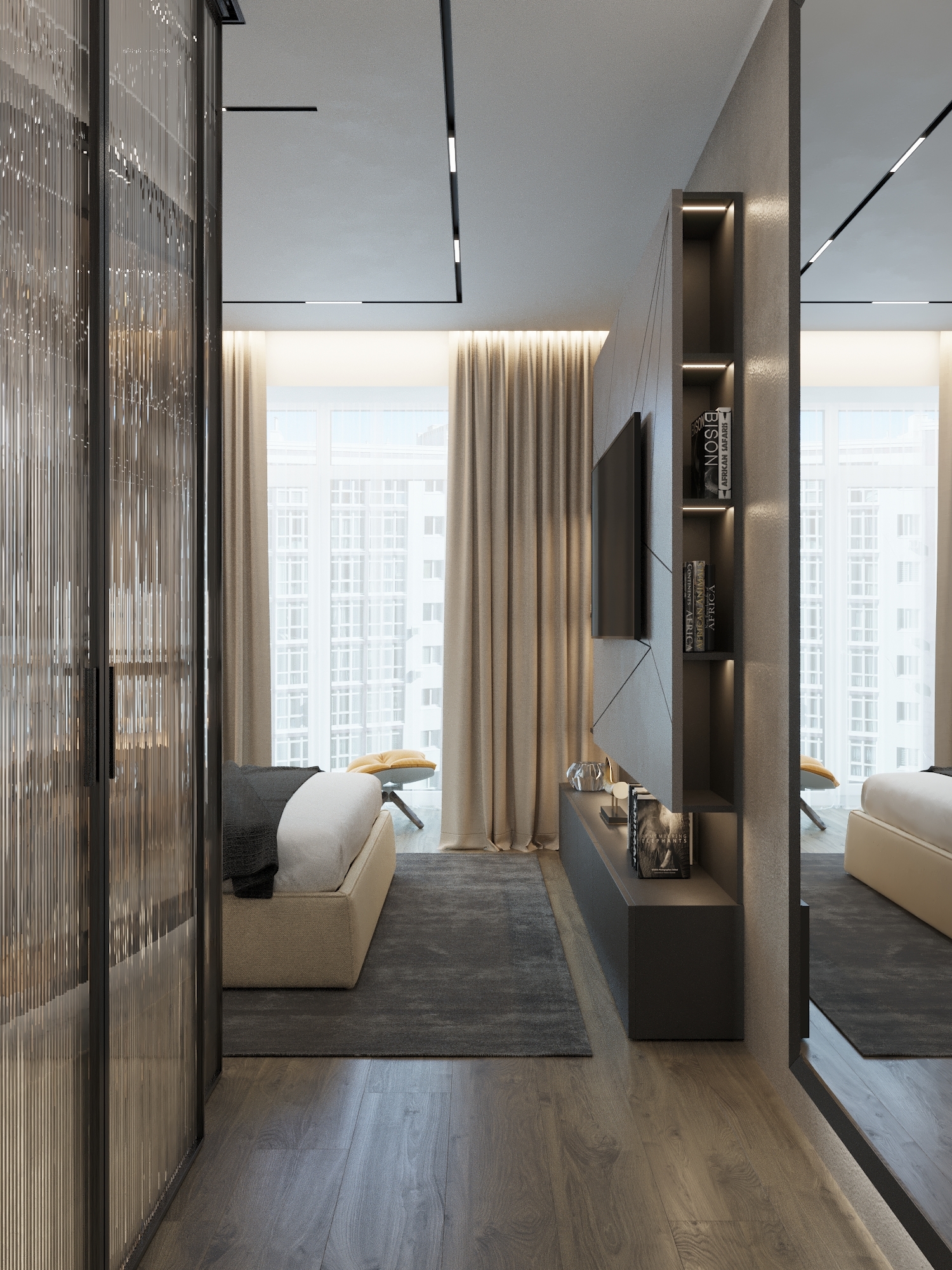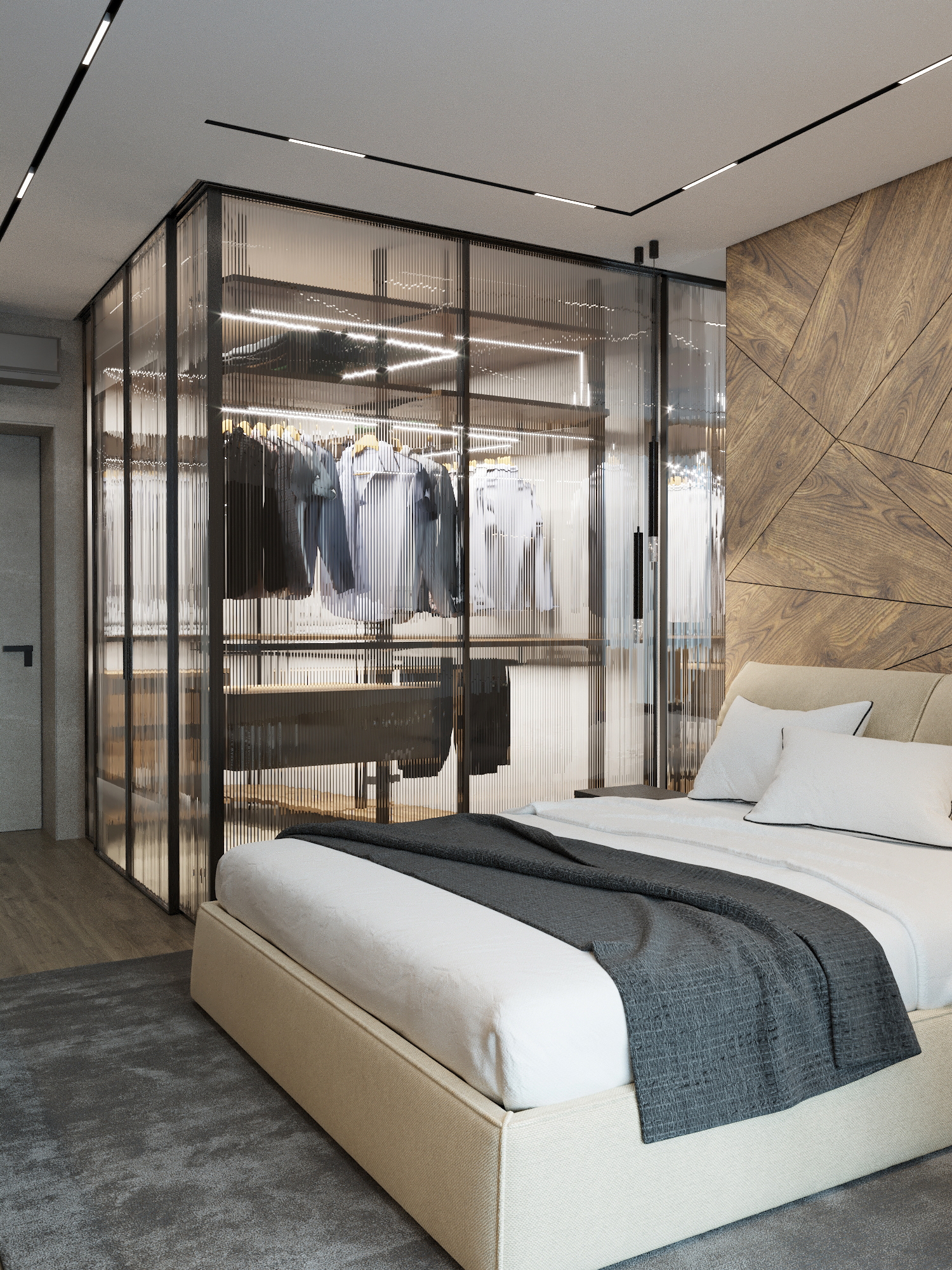 У квартирі ЖК Вишнева Оселя крім корпусних меблів було прийняте рішення зробити окрему гардеробну. Замість того, щоб ховати її за дверми, цю частину приміщення зробили цікавим акцентом. В гардеробну є вихід зі спальні. Вона виконана з прозорого скла, що візуально не краде простір та виглядає максимально естетично.