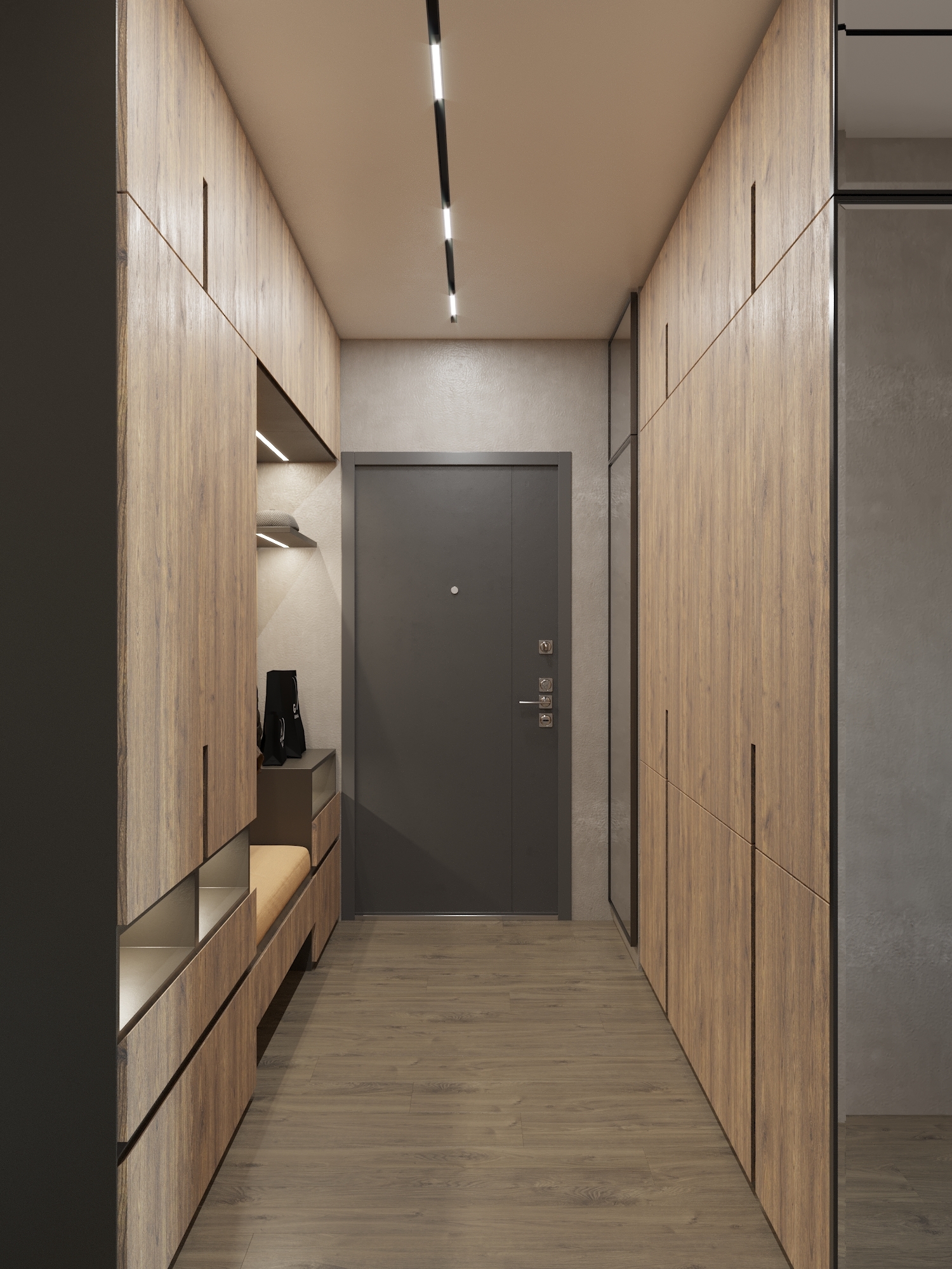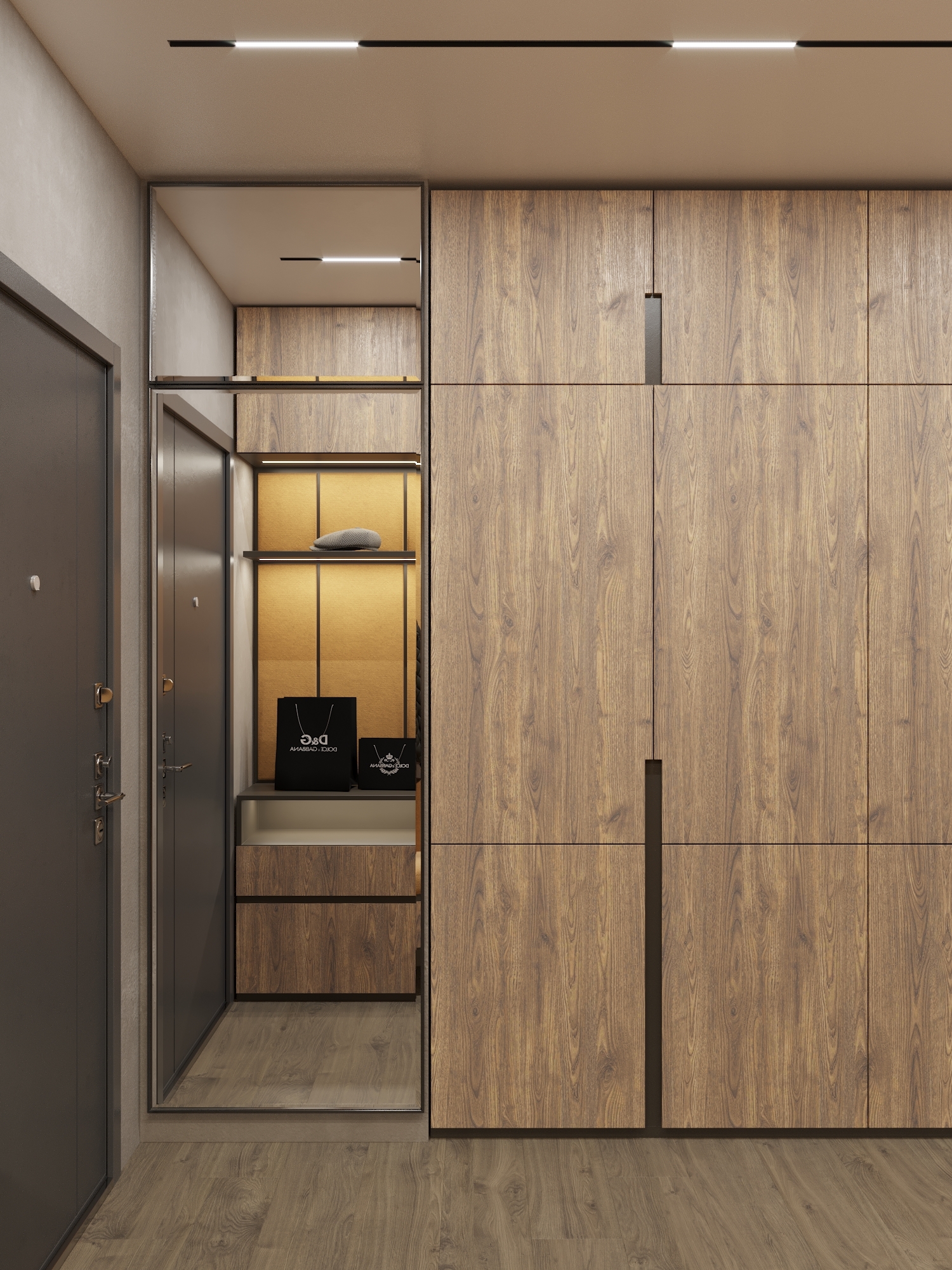 Окрім кольорового оформлення, при оформленні однокімнатної квартири, максимально відповідально поставилися до планувальних рішень. Щоб не переобтяжувати візуально простір було вирішено зробити всі корпусні меблі або вбудованими, або максимально непомітними. Вбудувати шафу не складно. Це дає можливість використати всі незручні кути та комори, порівнявши меблі з загальною стіною.