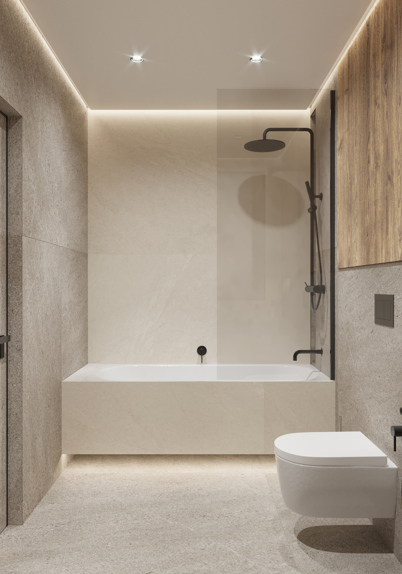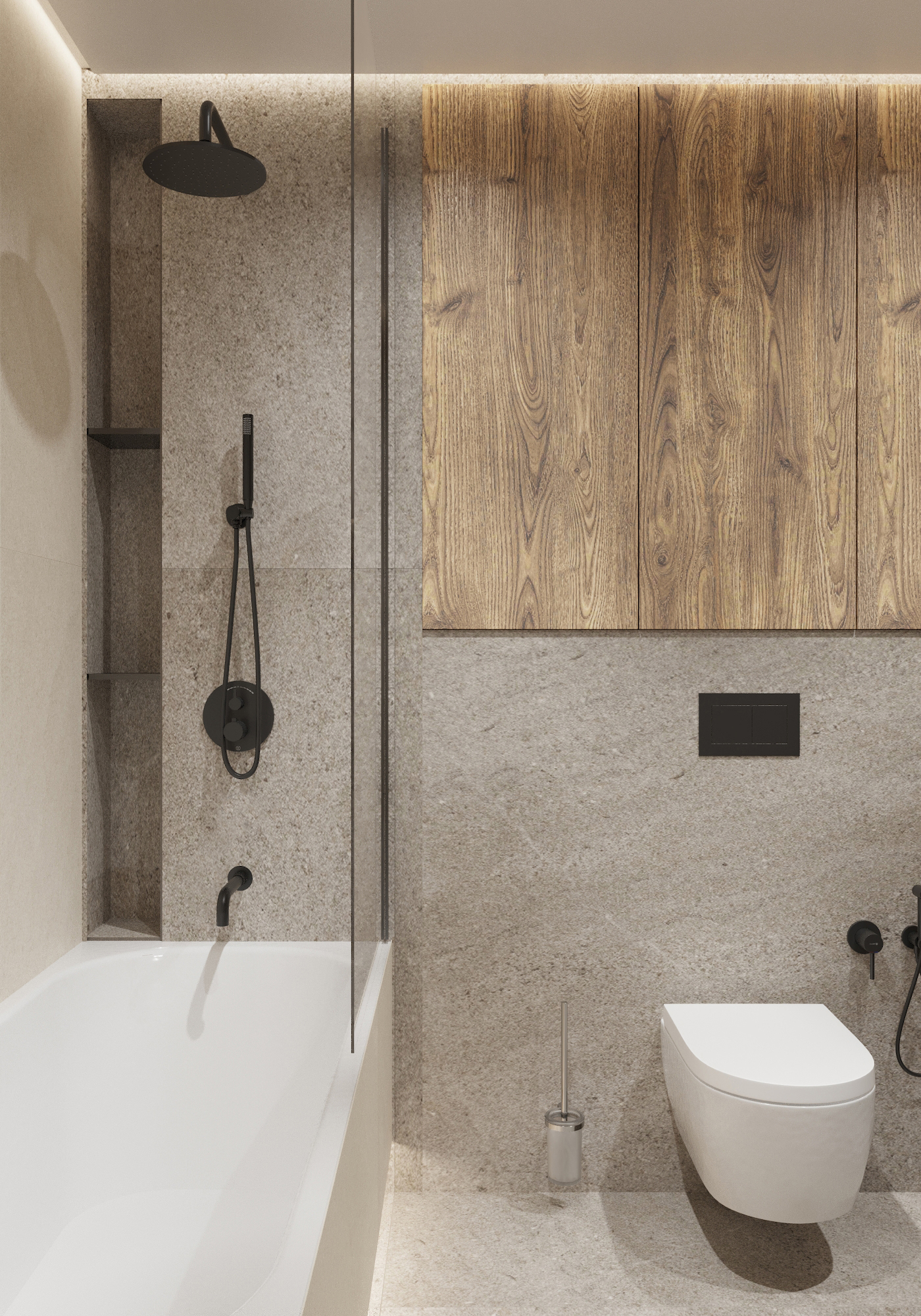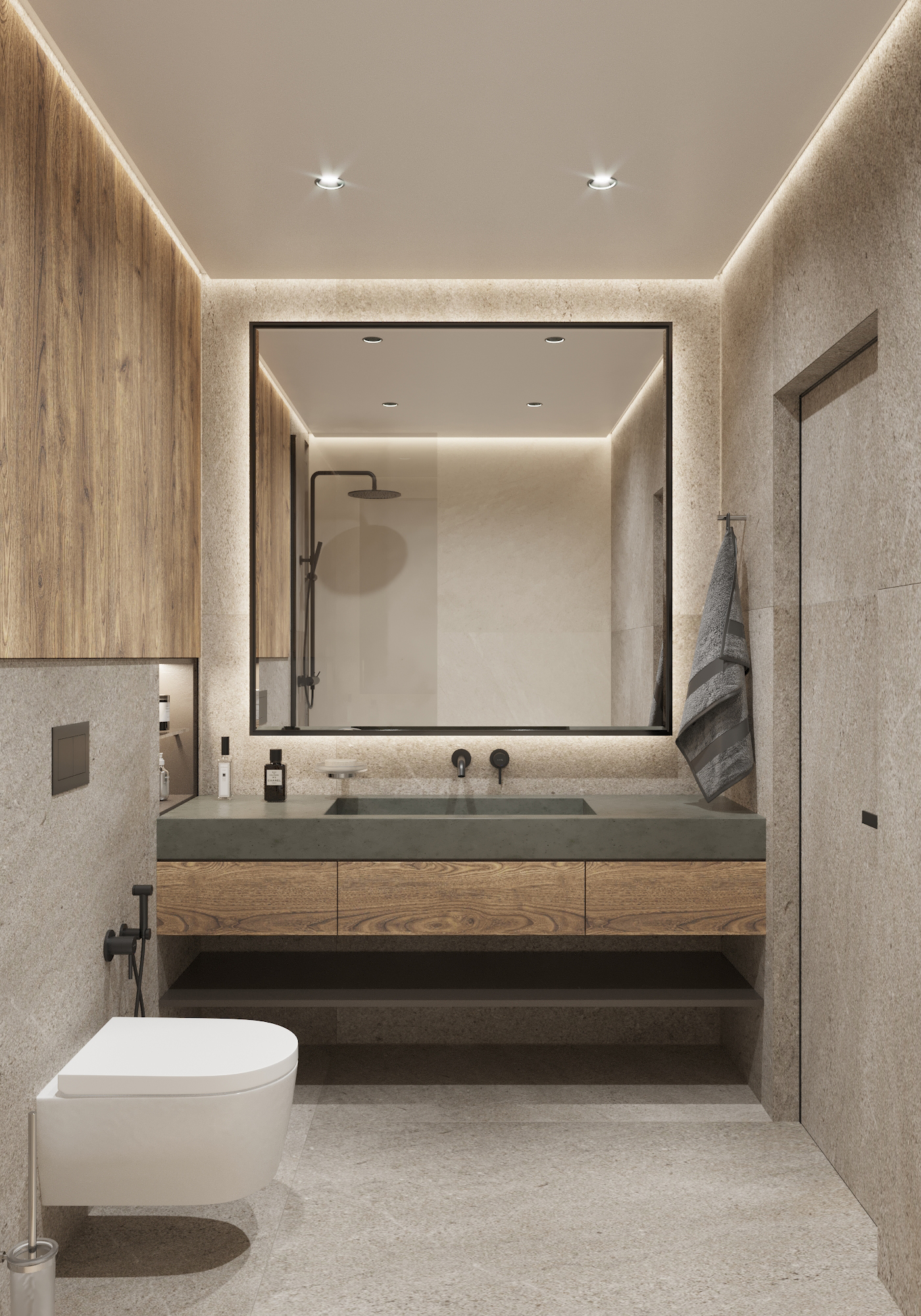 У санвузлі також витримана загальна концепція оформлення інтер'єру. Полиці або вбудовані у стіну, або виконані у вигляді інсталяцій. Фактури дерева також тут переплітаються із сірими палітрами. Безумовно, для ванної були обрані матеріали з високими показниками вологостійкості.