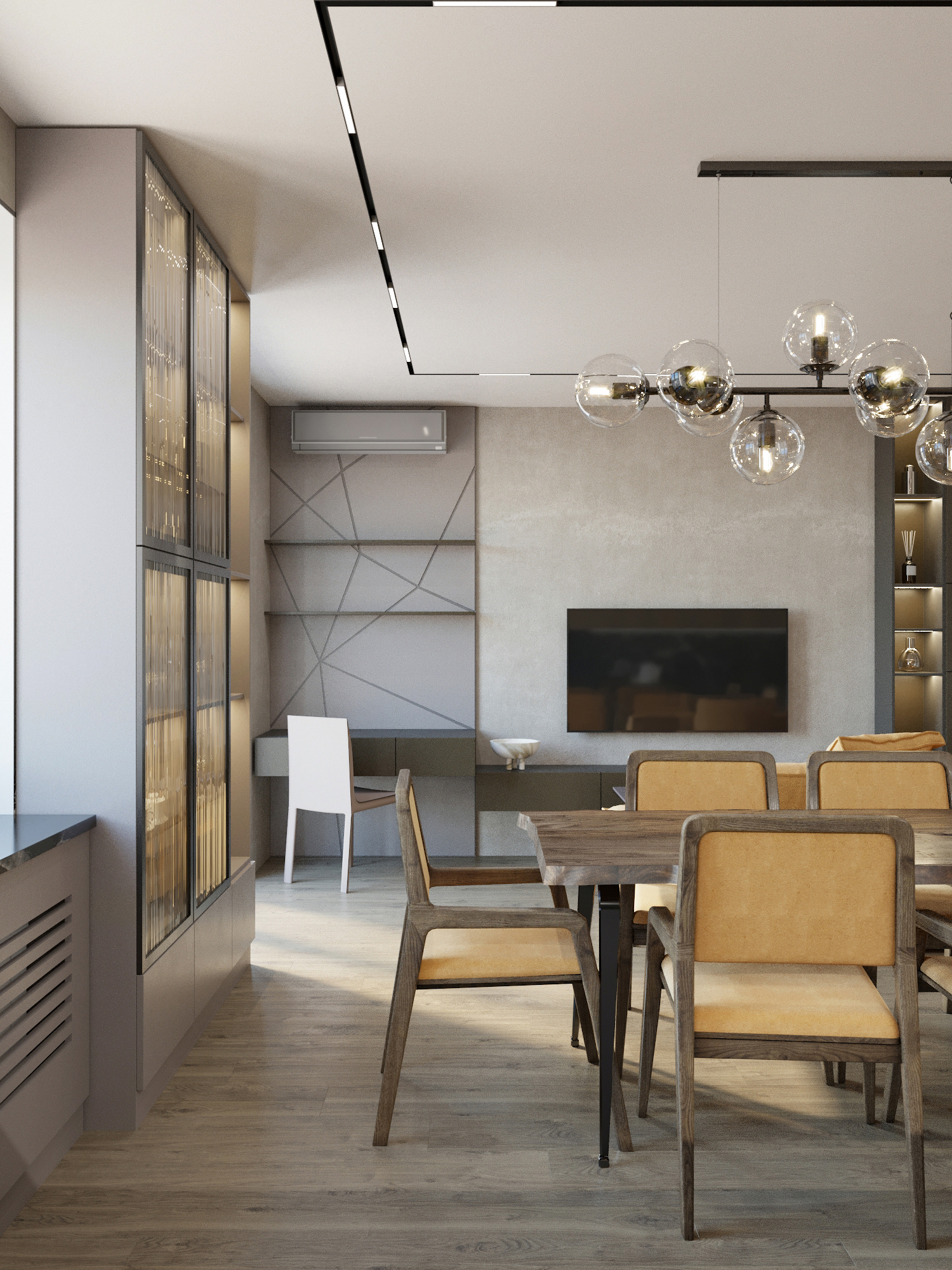 Зонує приміщення замість стіни саме обідній стіл. Завдяки відсутності перегородок вдалося розмістити місткий стіл з м’якими кріслами, для великої родини або компанії друзів. Одразу за столом починається зона вітальні. Акцентний диван у гірчичному кольорі чудово підкреслює зону вітальні, але не виділяється із загальної концепції. Беручи до уваги потреби мешканців, в цьому приміщенні дизайнери зробили додаткове робоче місце. Поруч з зоною ТВ була вмонтована невелика навісна полиця-стіл, де можна буде зручно працювати та розв'язувати певні питання.