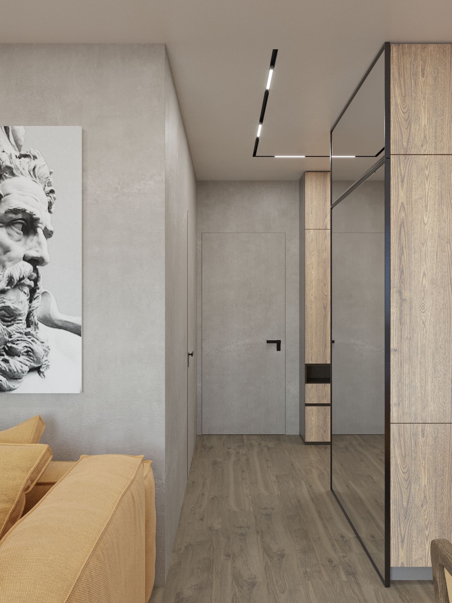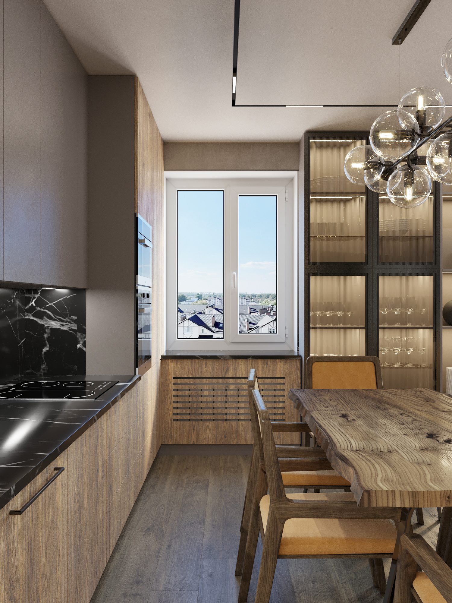 Як і в більшості об’єктів, ця однокімнатна квартира має кімнату-студію. Кухня поєднані зі гостиною. Враховуючи обмеженість простору, навіть підвіконня тут зробили частиною робочої поверхні, додатковим місцем для розміщення кухонного приладдя. Кухонний гарнітур - це високі до стелі шафи, в які вбудована вся техніка та прихований посуд. Дерев'яні фактури на фасадах ідеально переплітаються із сірими матовими, створюючи гармонійний ефект.
