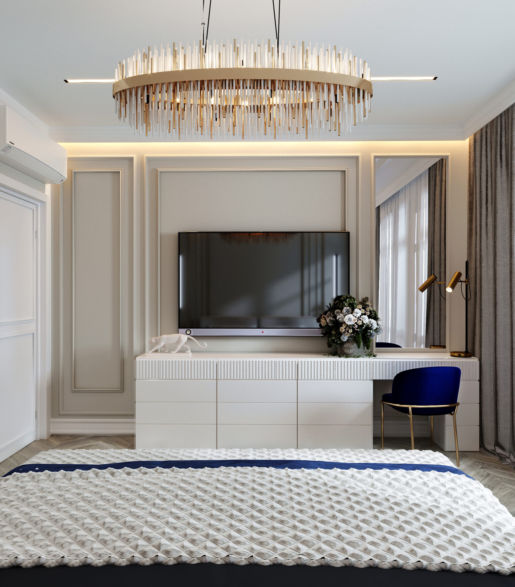 Обрано розкішне ліжко з високим оксамитовим узголів'ям синього кольору (каретна стяжка). Навпроти ліжка — зона з туалетним столиком та ТБ.
