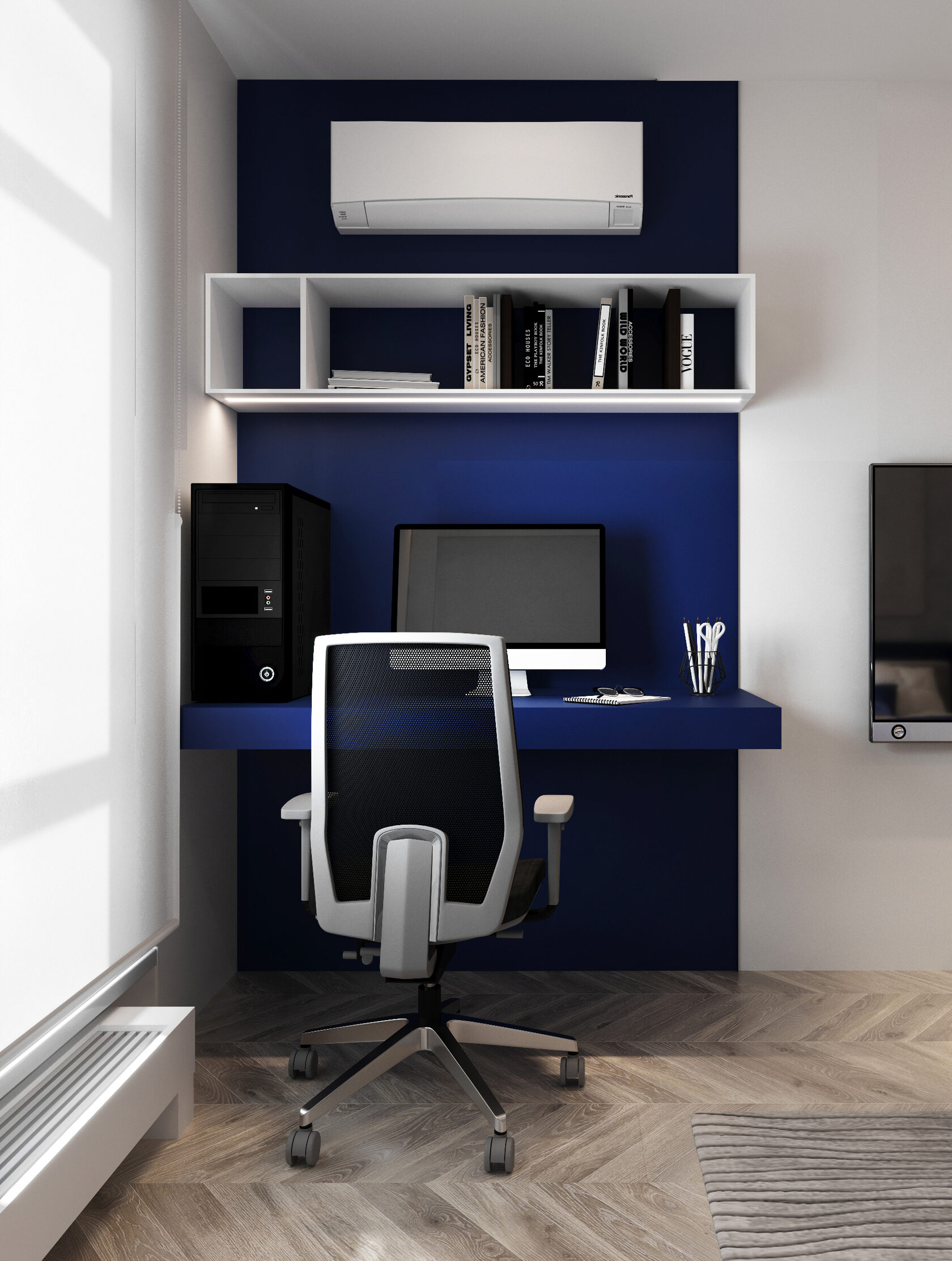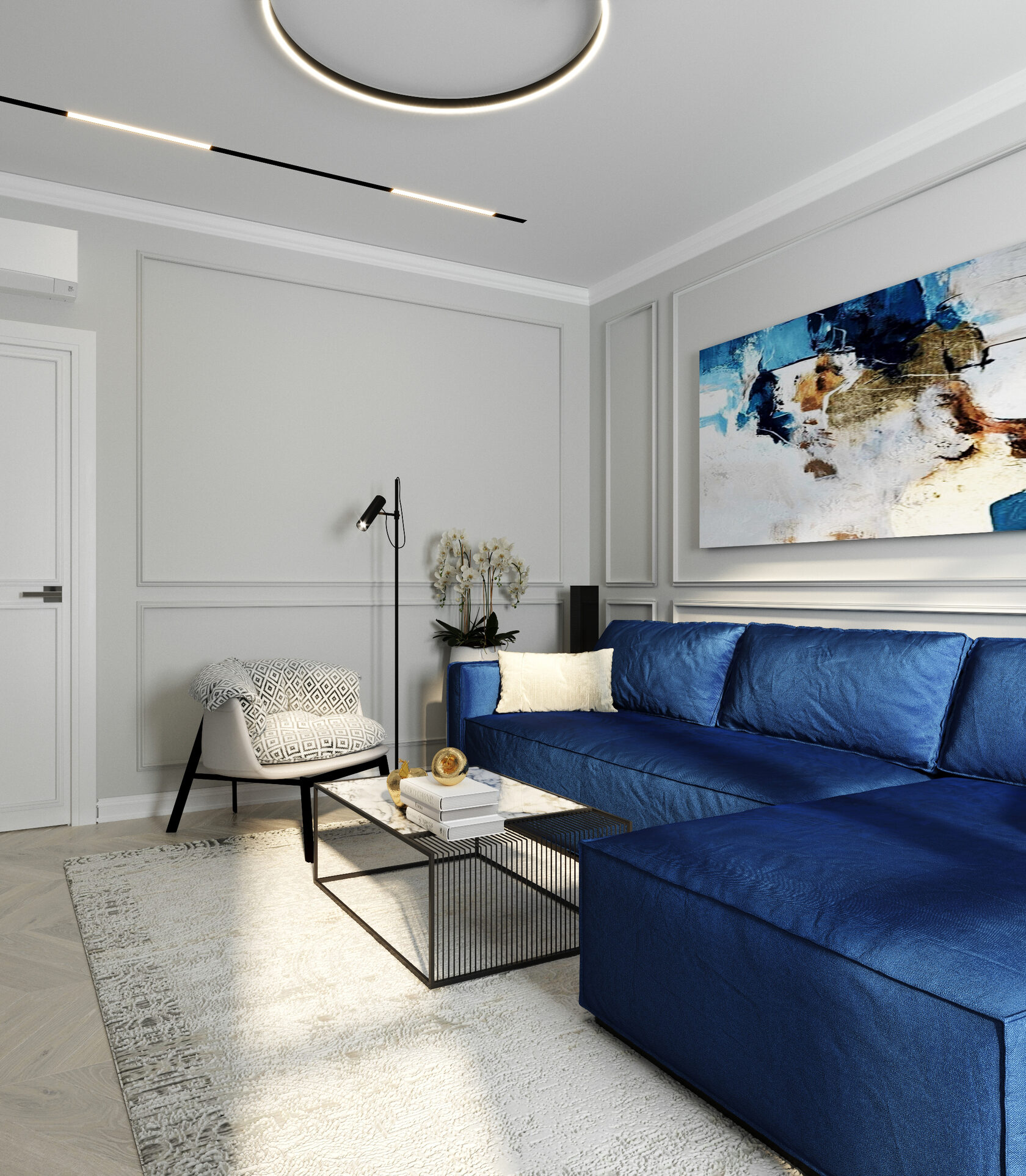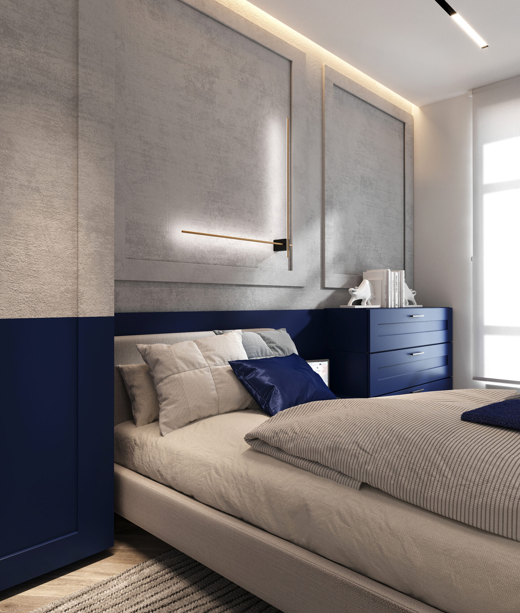 Дитяча кімната є більш графічною та орієнтованою на потреби молодшого мешканця. В ній поєднано сині панелі із сірої штукатурки (під бетон) на стінах. Лаконічна підвісна стільниця синього кольору інтегрована в нішу, що зручно під час навчання. Зважаючи на стать, вік та індивідуальні побажання дитини, для цієї кімнати були обрані сучасні лінійні світильники та мінімалістичні полиці.