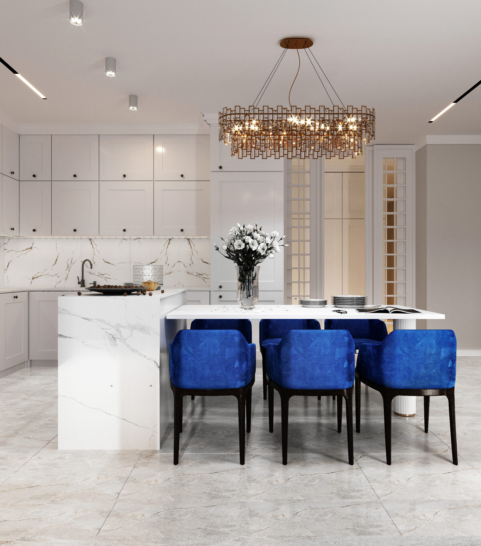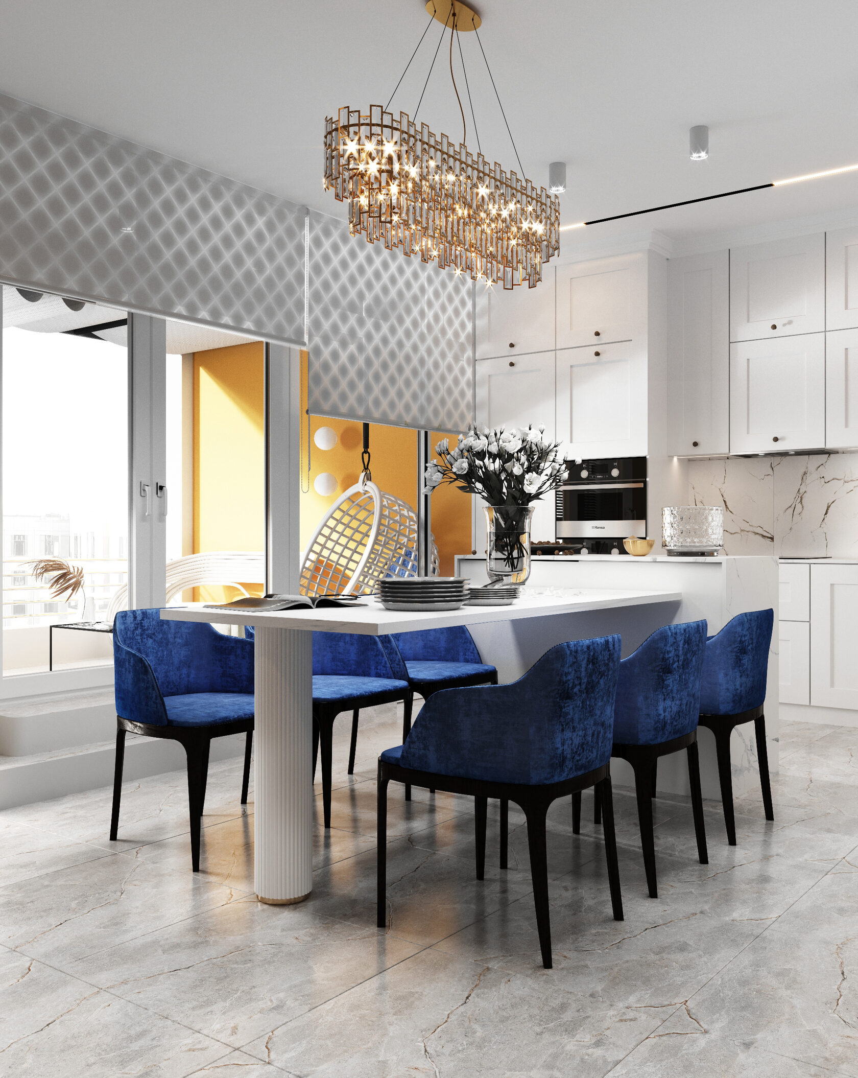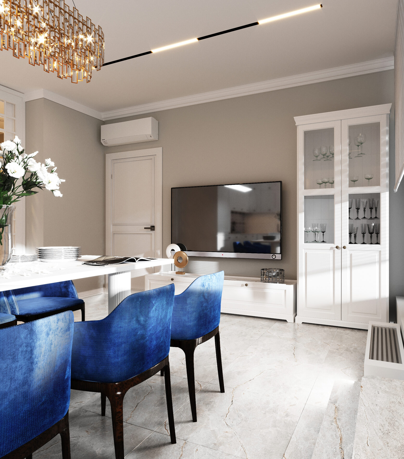 Головний акцент в обідній зоні — це м'які крісла насиченого синього кольору. Над столом розміщена масивна кришталева люстра в золотистій оправі, що додає інтер'єру статусності. Кімната досить простора, що дозволило розмістити навпроти обіднього столу ТБ-зону з невеликою тумбою під нею та сервантом зі скляними дверцятами поруч. На меблях, дверях, оздобленні стін присутні невеликі молдинги. Це додає естетики та цікавих акцентів.