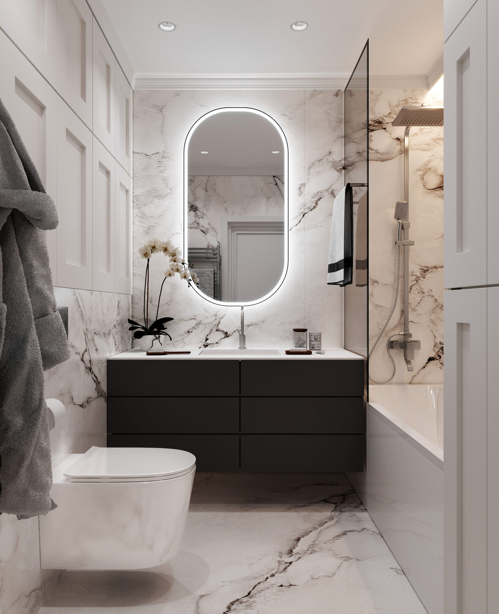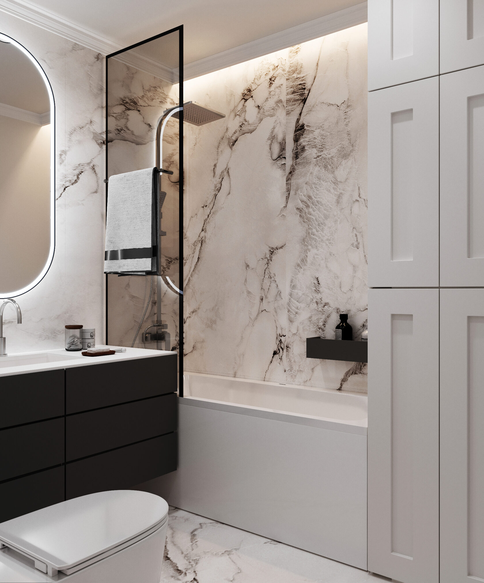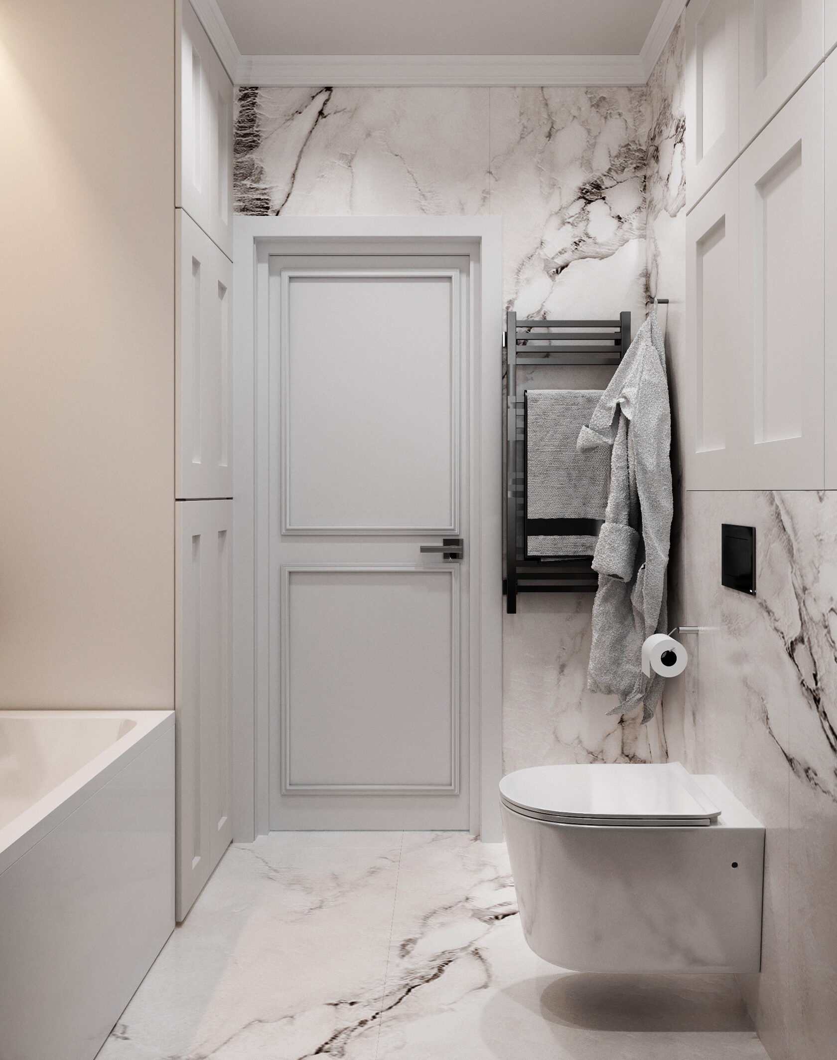 - ТБ-зону на стіні, яка балу декорована класичними молдингами;