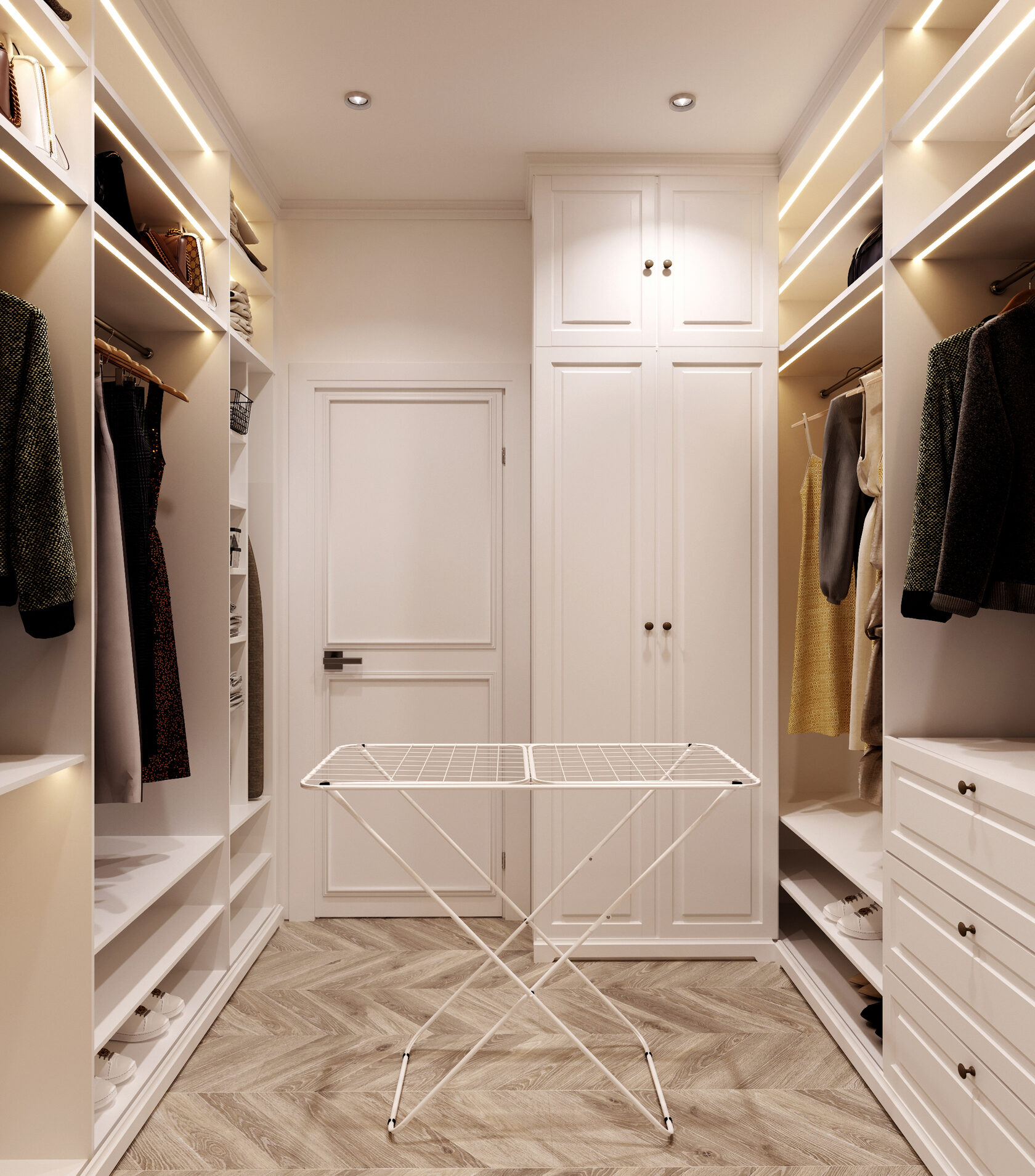 Якщо дизайн проект у Гданську (іншому місті) матиме схожу концепцію, дизайнери обов'язково запланують в такій оселі гардеробну. У квартирі ЖК Найкращий у м. Ірпінь гардеробна виступає окремою кімнатою з відкритими системами зберігання, підсвіткою полиць та великою кількістю висувних шухляд. Навіть в ній збережена неокласична естетика фасадів.