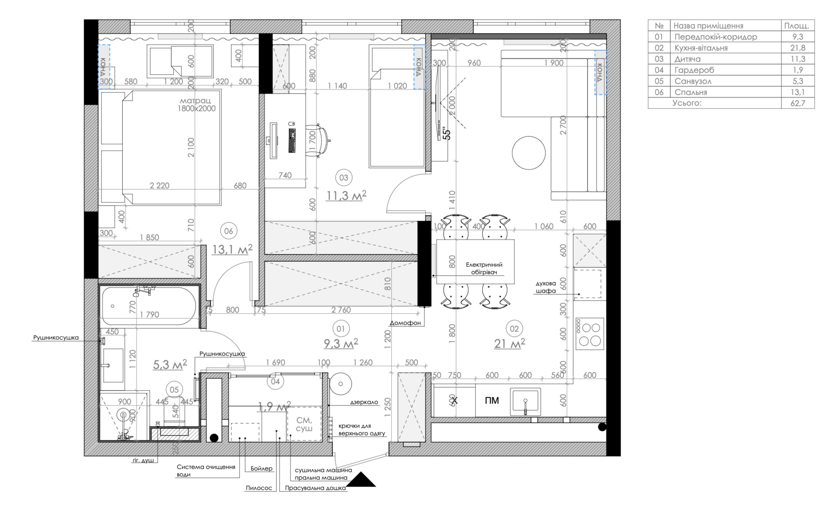 Ця двокімнатна квартира площею всього 60 м2 є комфортним житлом для родини з дітьми. Під двома кімнатами маються на увазі повноцінні та окремі приміщення з дверьми. Це спальня та дитяча.