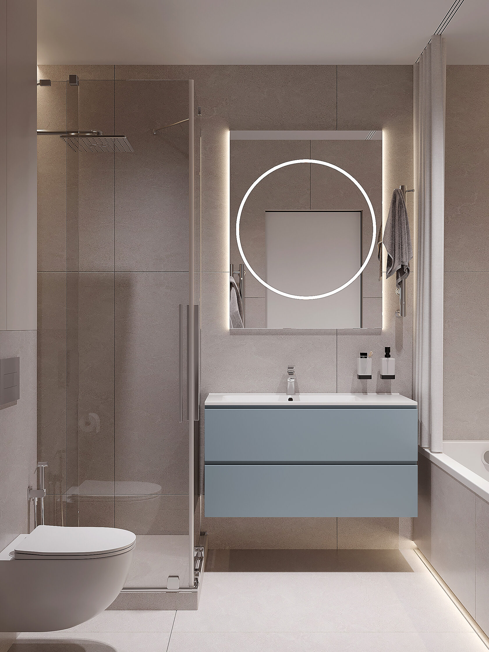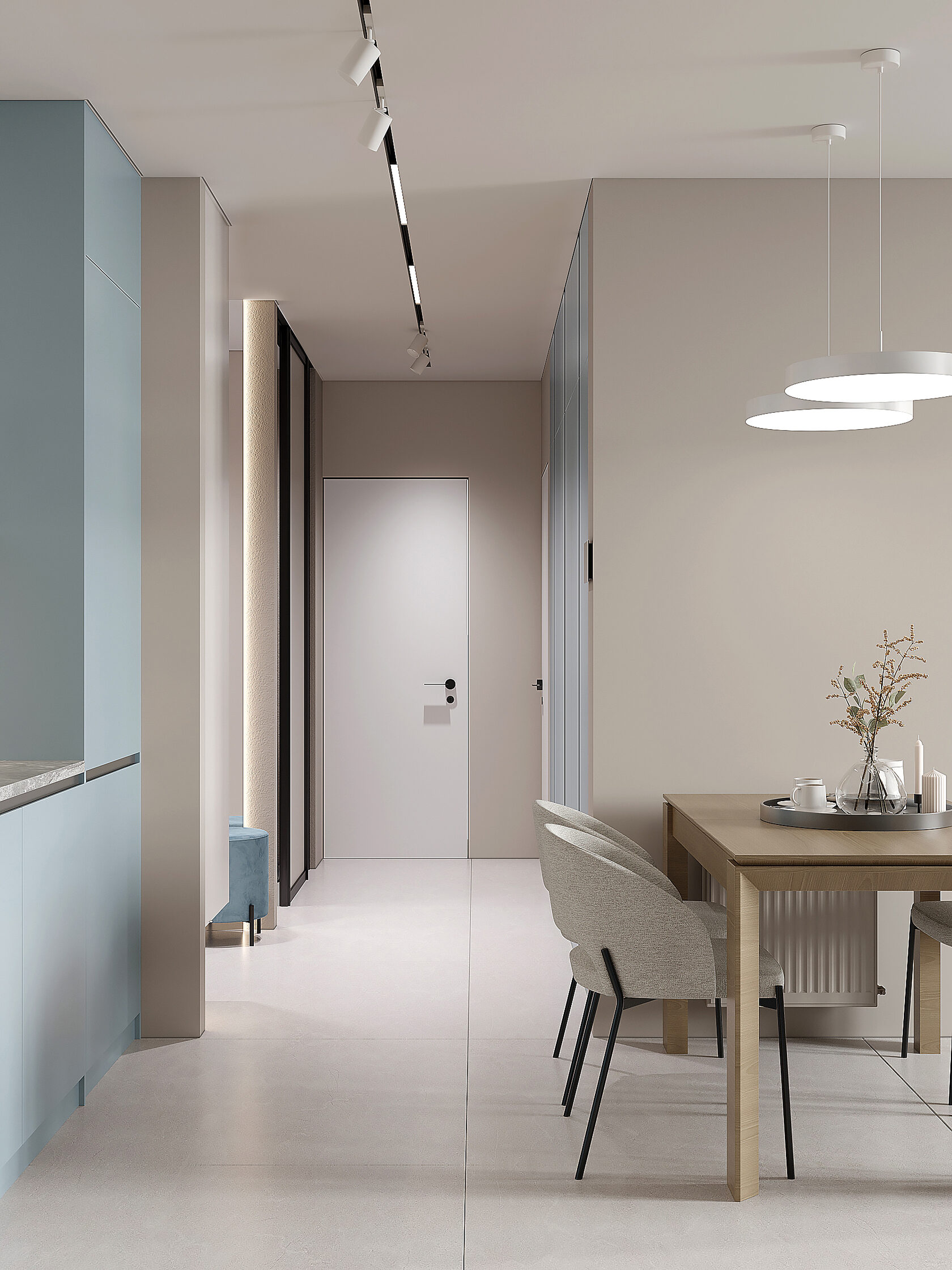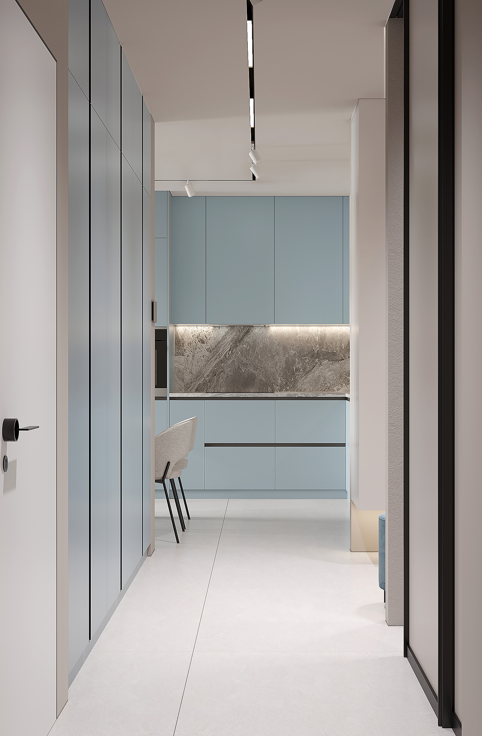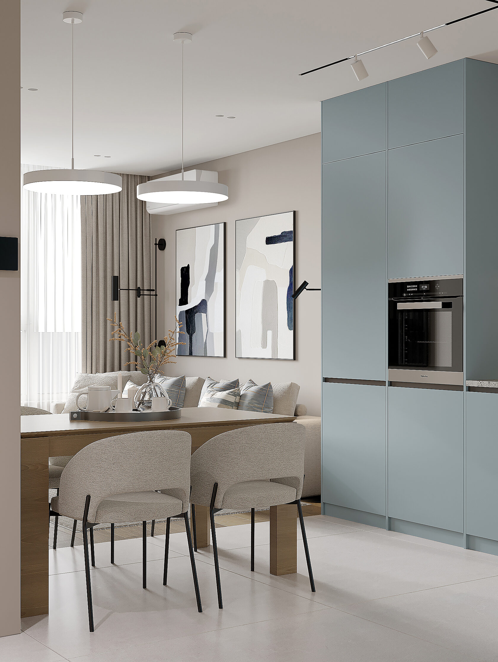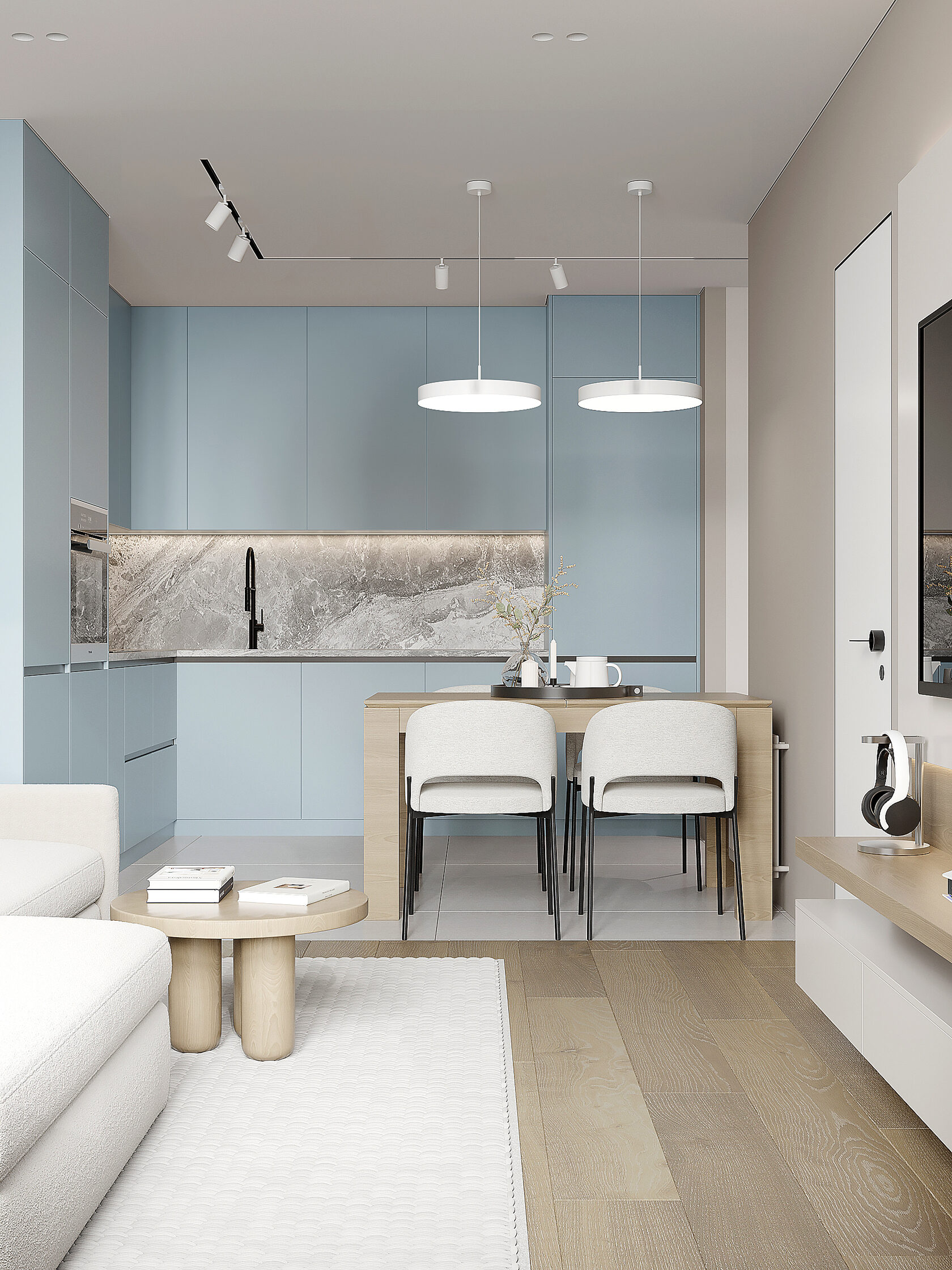 У квартирі присутня кімната-студія, яка поділена на функціональні зони. Розподіл вдалося зробити за допомогою меблів, точковому підсвічуванню, плавним переходам кольорів та фатур. Кухня відповідає загальній концепції, тому меблі в ній виконані в гарному блакитному кольорі. Однотонні матові фасади висотою до стелі не мають ручок та непотрібного декору. Техніка та кухонний інвентар тут сховані за фасадами. Кухня та гостинна мають різне підлогове покриття (плитка та паркет). Додатково розділяють ці дві зони обідні стіл, який размістить цілу родину.