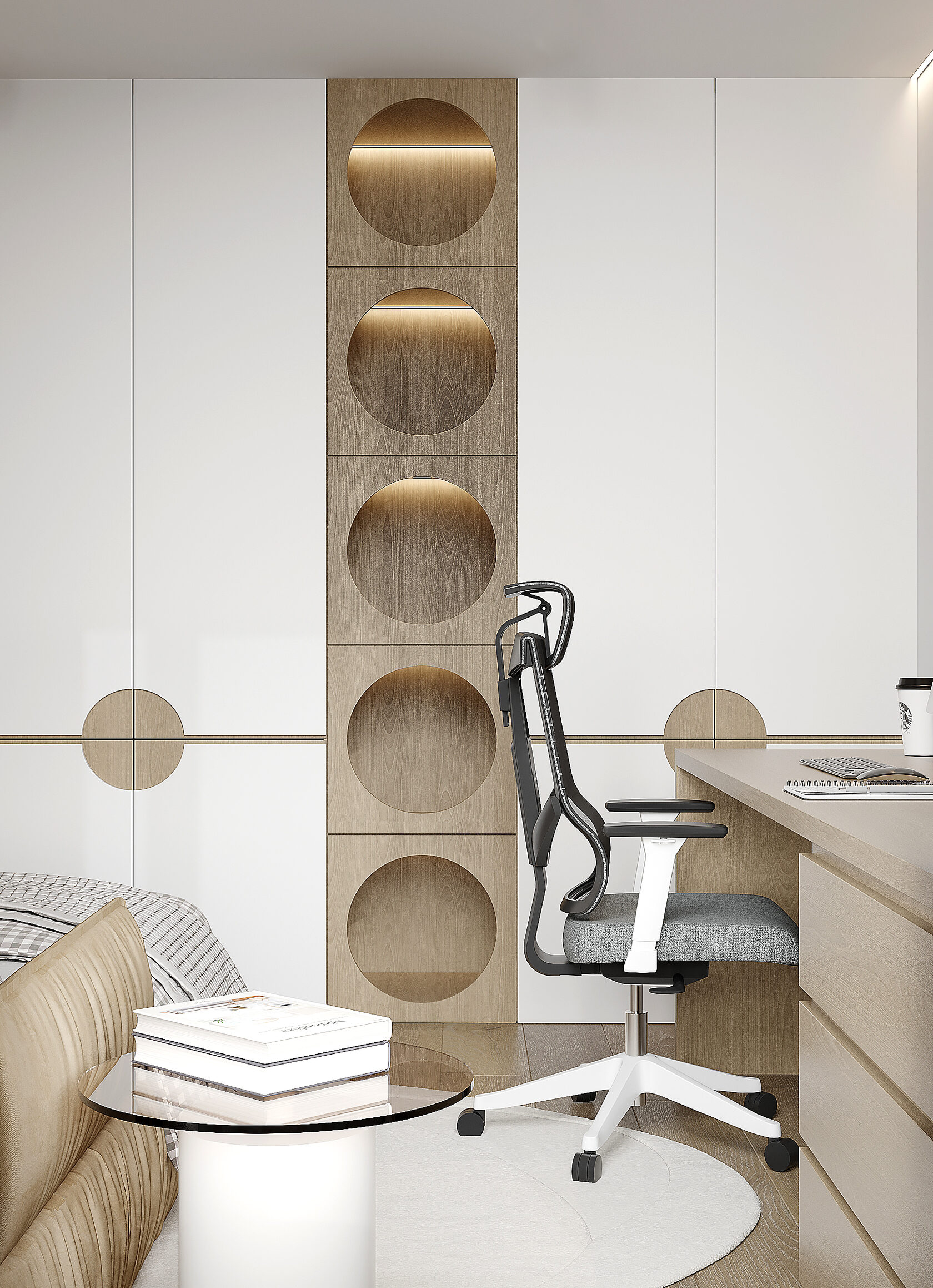 Дитячу дизайнер інтер'єрів зробив окремим та персоналізованим простором. Адже крім місця для сну, в цих приміщеннях надважливим є створення куточка для ігор та занять. В цій дитячий все це вміщено. Окрему увагу приділили корпусним меблям, які зайняли одну зі стін та стали цікавою частиною в приміщення (це не просто шафа).