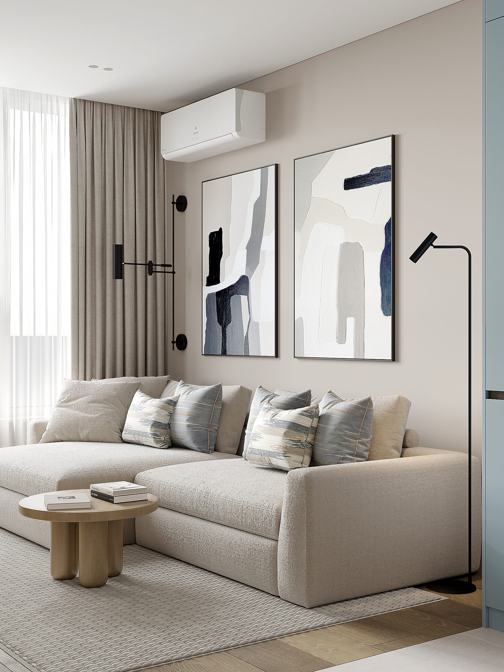 Беручи до уваги обмеженість квадратури, було прийняте рішення використання світлих палітр. Небесно блакитний та білий у поєднанні з природними фактурами дерева - все це виглядає максимально органічно. Замість дотримання надсучасної стилістики, перевага надається практичним направленням. У сучасному оформленні квартири гармонійно поєднані елементи Скандинавського, еко та мінімалістичного стилів.