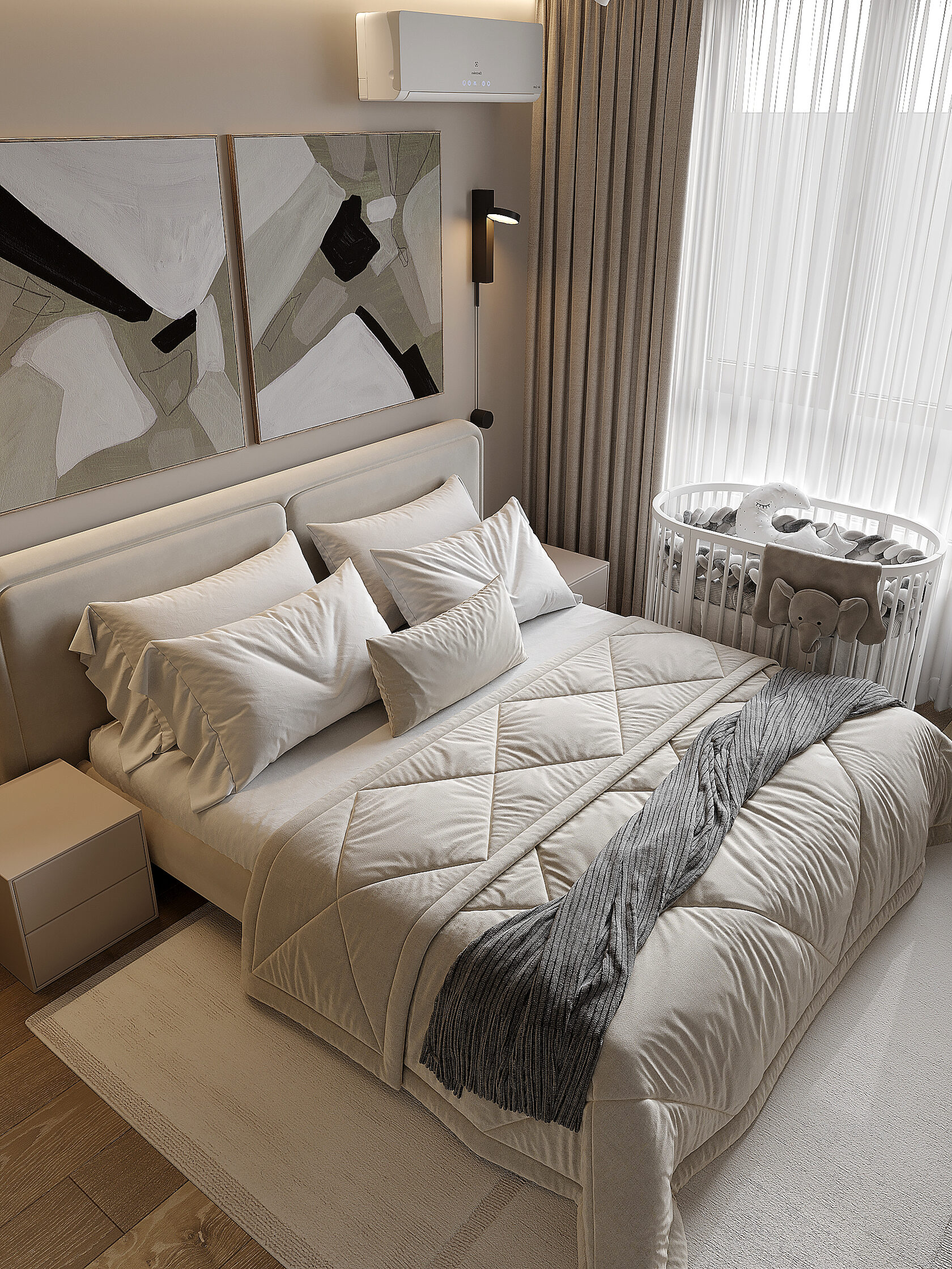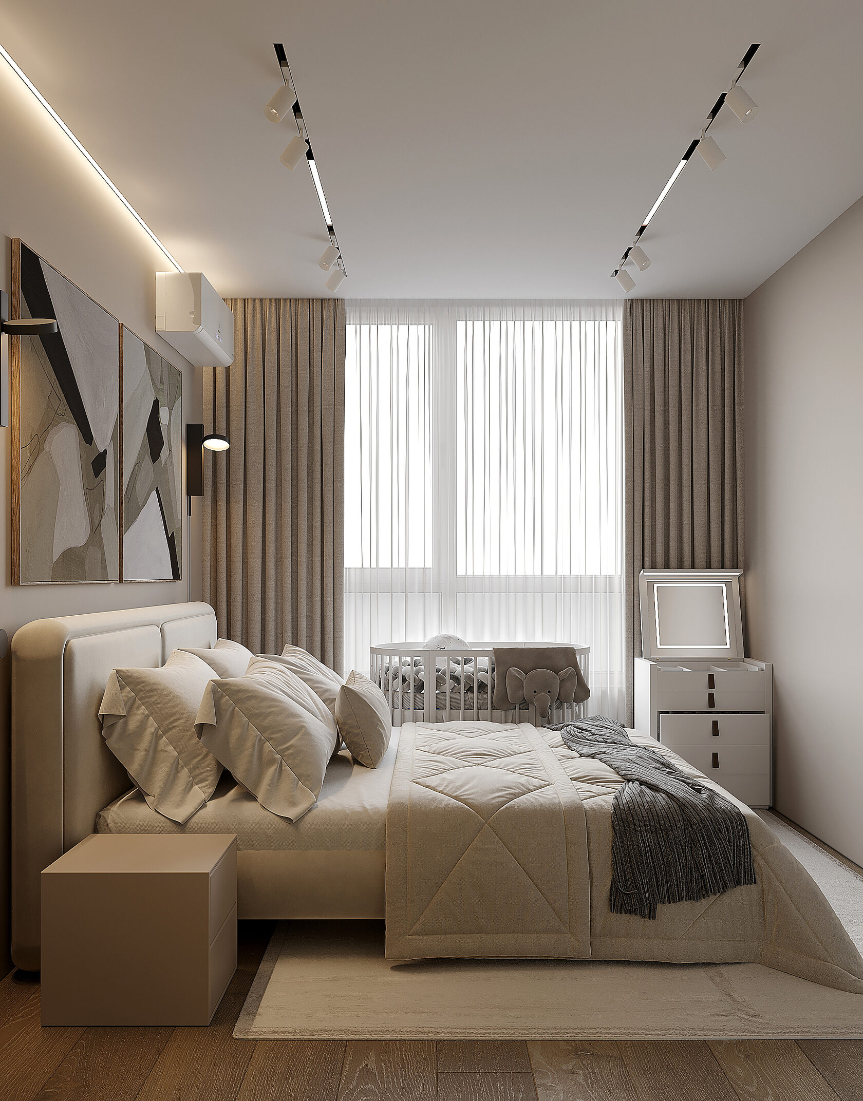 Спальня, не дивлячись на досить невеликий простір, вмістила в собі двоспальне ліжко, шафу, приліжкові ящики, дитяче ліжечко. Дизайн кімнати доволі спокійний та витриманий. Всі елементи гармонійно поєднані між собою, без різких контрастів та непотрібних елементів.