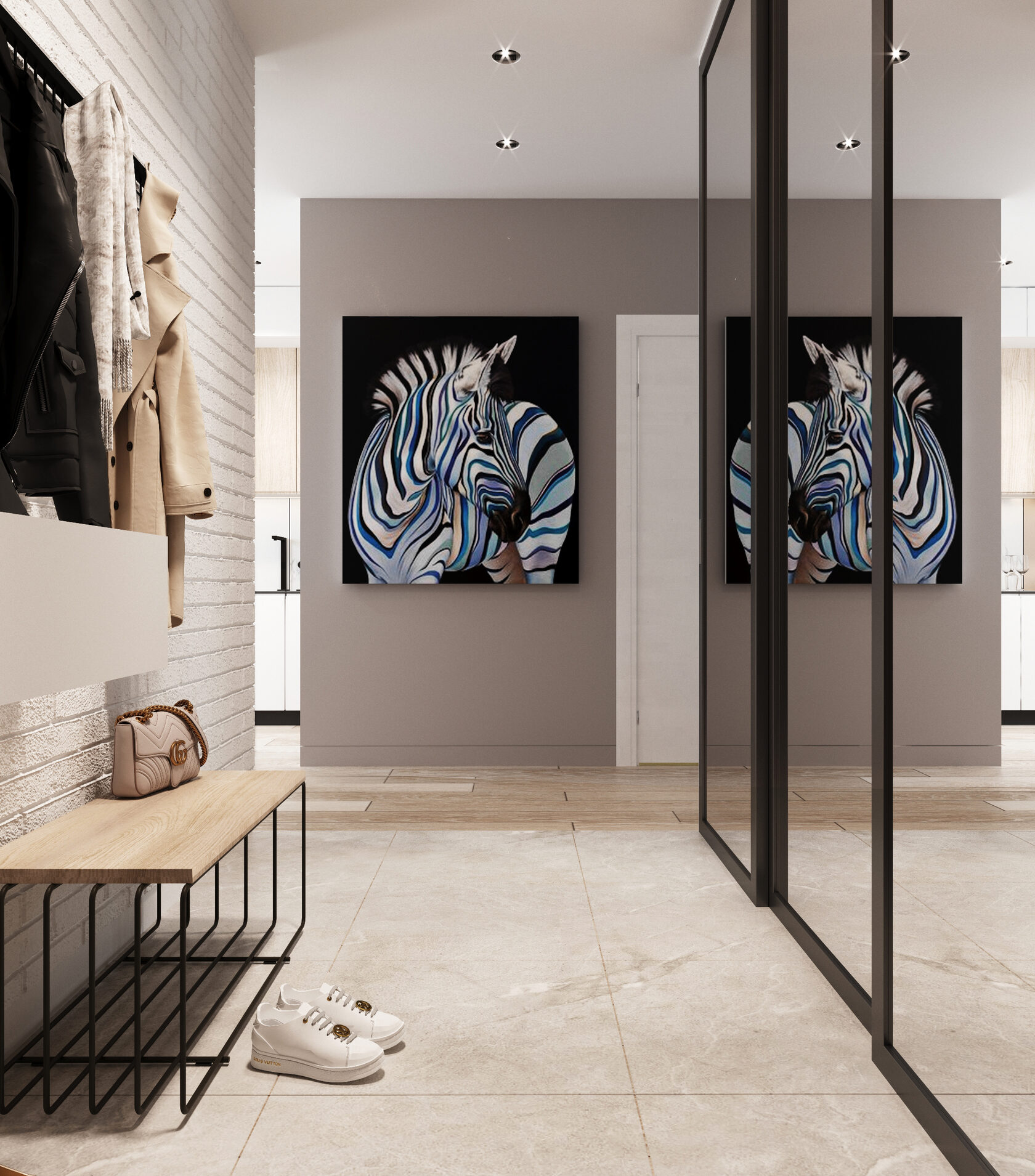 Простір не захаращено непотрібними елементами декору. Естетика досягнута за допомогою правильного вибору оздоблення, декорування стін дерев'яними панелями та правильно підібраними меблями. Корпусні конструкції зроблені під замовлення, що забезпечує максимально раціональне використання простору. Кожний см2 облаштовано, уникнено наявність щілин та непотрібних ніш. Самі матеріали меблів підібрано відповідно до оздоблення стін. Шафи тут плавно перетікають в оздоблення, не привертаючи зайвої уваги.